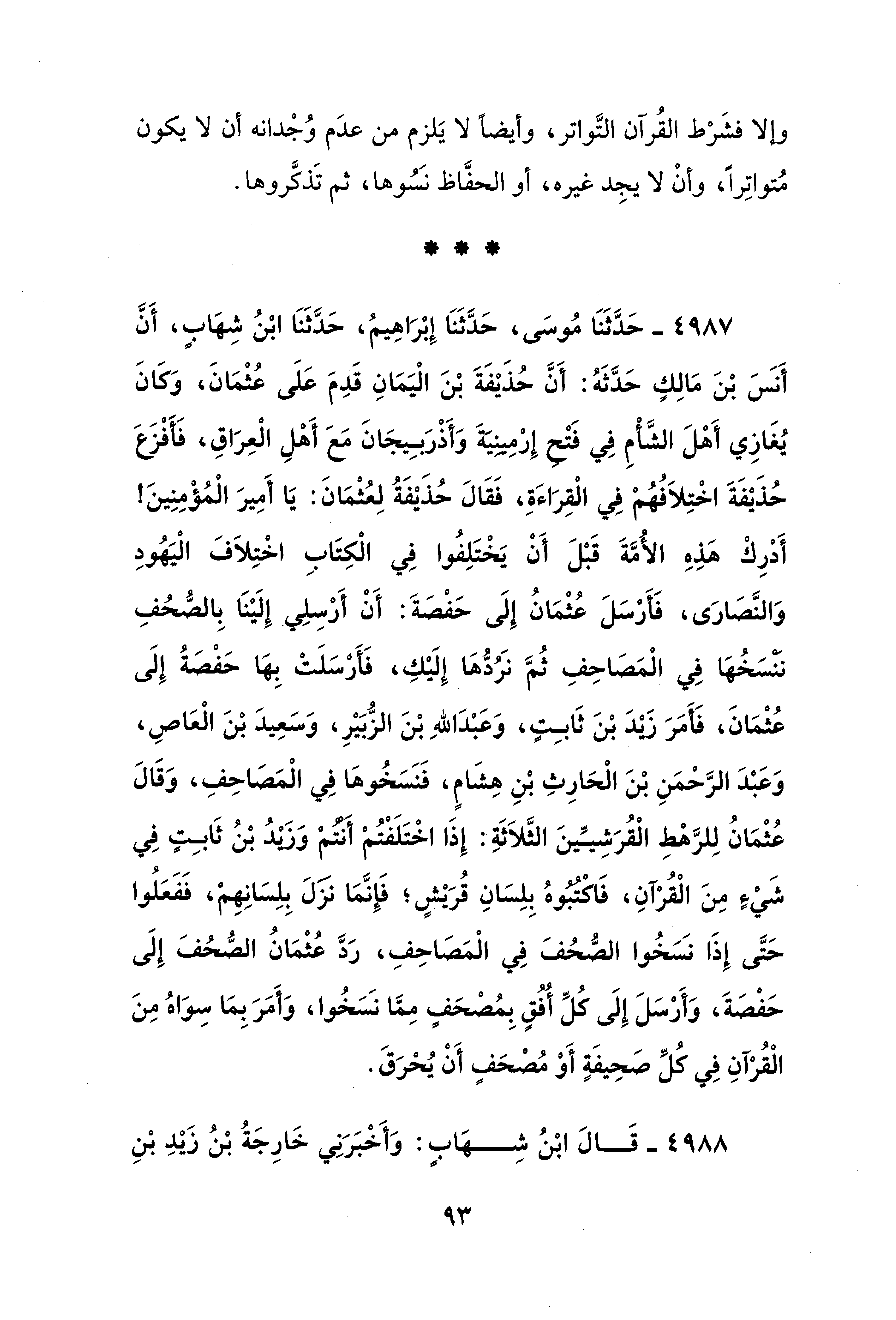 4987 - حَدَّثَنَا مُوسَى، حَدَّثَنَا إِبْرَاهِيمُ، حَدَّثَنَا ابْنُ شِهَابٍ، أَنَّ أَنس بْنَ مَالِكٍ حَدَّثَهُ: أَنَّ حُذَيْفَةَ بْنَ الْيَمَانِ قَدِمَ عَلَى عُثْمَانَ، وَكَانَ يُغَازِي أَهْلَ الشَّاْمِ فِي فَتْح إِرْمِينِيَةَ وَأَذْرَبِيجَانَ مَعَ أَهْلِ الْعِرَاقِ، فأَفْزَعَ حُذَيْفَةَ اخْتِلاَفُهُمْ فِي الْقِرَاءَةِ، فَقَالَ حُذَيْفَةُ لِعُثْمَانَ: يَا أَمِيرَ الْمُؤْمِنِينَ! أَدْرِكْ هَذِهِ الأُمَّةَ قَبْلَ أَنْ يَخْتَلِفُوا فِي الْكِتَابِ اخْتِلاَفَ الْيَهُودِ وَالنَّصَارَى، فَأَرْسَلَ عُثْمَانُ إِلَى حَفْصَةَ: أَنْ أَرْسِلِي إِلَيْنَا بِالصُّحُفِ ننسَخُهَا فِي الْمَصَاحِفِ ثُمَّ نَرُدُّهَا إِلَيْكِ، فَأرْسَلَتْ بِهَا حَفْصَةُ إِلَى عُثْمَانَ، فَأَمَرَ زَيْدَ بْنَ ثَابِتٍ، وَعَبْدَ اللهِ بْنَ الزُّبَيْرِ، وَسَعِيدَ بْنَ الْعَاصِ، وَعَبْدَ الرَّحْمَنِ بْنَ الْحَارِثِ بْنِ هِشَامٍ، فَنَسَخُوهَا فِي الْمَصَاحِفِ، وَقَالَ عُثْمَانُ لِلرَّهْطِ الْقُرَشِيِّينَ الثَّلاَثَةِ: إِذَا اخْتَلَفْتُمْ أَنتمْ وَزيدُ بْنُ ثَابِتٍ فِي شَيْء مِنَ الْقُرْآنِ، فَاكْتُبُوهُ بِلِسَانِ قُرَيْشٍ؛ فَإِنَّمَا نزَلَ بِلِسَانِهِمْ، فَفَعَلُوا حَتَّى إِذَا نَسَخُوا الصُّحُفَ فِي الْمَصَاحِفِ، رَدَّ عُثْمَانُ الصُّحُفَ إِلَى حَفْصَةَ، وَأَرْسَلَ إِلَى كُلِّ أُفُقٍ بِمُصْحَفٍ مِمَّا نَسَخُوا، وَأَمَرَ بِمَا سِوَاهُ مِنَ الْقُرْآنِ فِي كلِّ صَحِيفَةٍ أَوْ مُصْحَفٍ أَنْ يُحْرَقَ.
