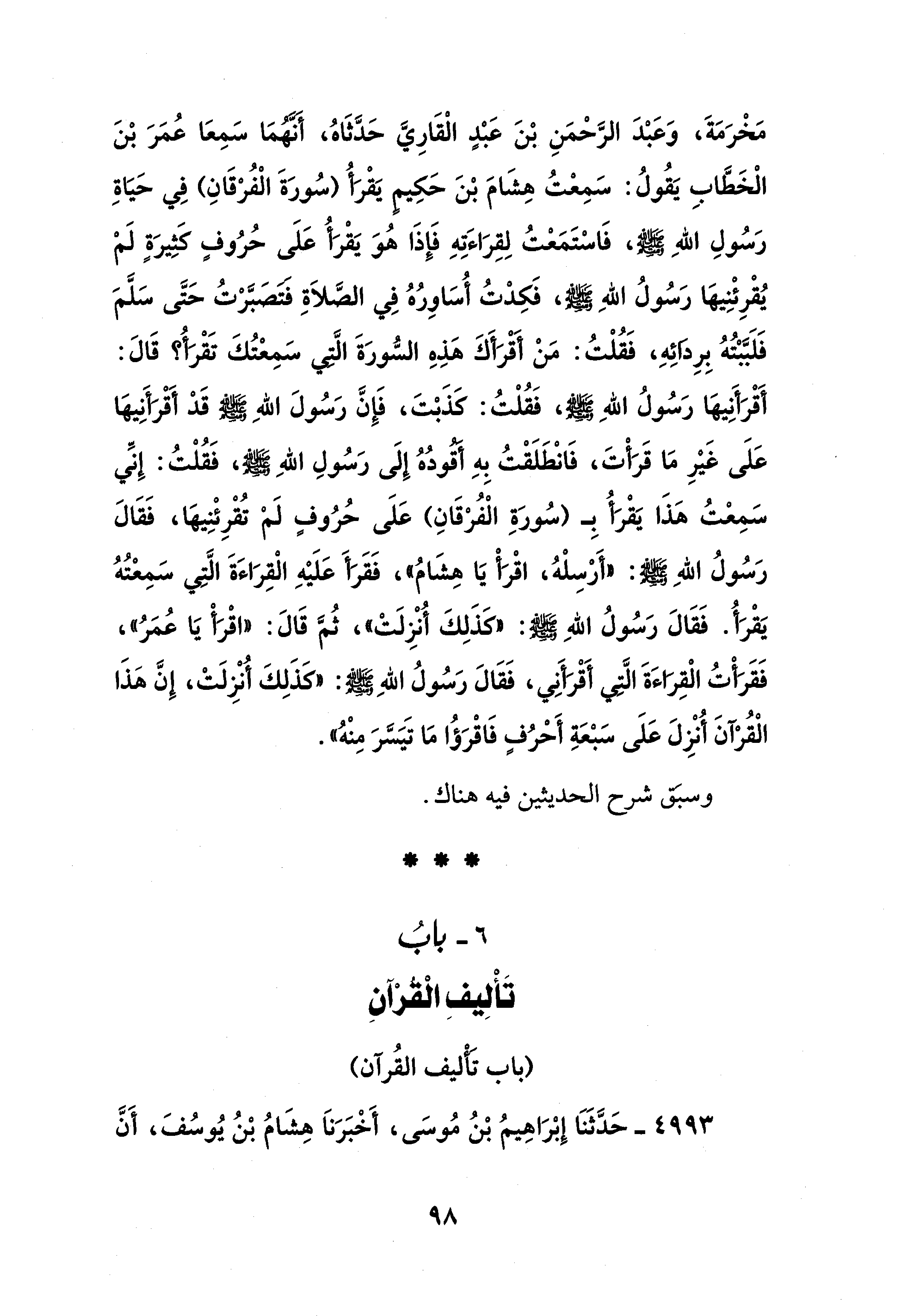 مَخْرَمَةَ، وَعَبْدَ الرَّحْمَنِ بْنَ عَبْدٍ الْقَارِيَّ حَدَّثَاهُ، أَنَّهُمَا سَمِعَا عُمَرَ بْنَ الْخَطَّابِ يَقُولُ: سَمِعْتُ هِشَامَ بْنَ حَكِيم يَقْرَأُ (سُورَةَ الْفُرْقَانِ) فِي حَيَاةِ رَسُولِ اللهِ - صلى الله عليه وسلم -، فَاسْتَمَعْتُ لِقِرَاءَتِهِ فَإِذَا هُوَ يَقْرَأُ عَلَى حُرُوفٍ كَثِيرَةٍ لَمْ يُقْرِئْنِيهَا رَسُولُ اللهِ - صلى الله عليه وسلم -، فَكِدْتُ أُسَاوِرُهُ فِي الصَّلاَةِ فَتَصَبَّرْتُ حَتَّى سَلَّمَ فَلَبَّبْتُهُ بِرِدَائِهِ، فَقُلْتُ: مَنْ أَقْرَأَكَ هَذِهِ السُّورَةَ الَّتي سَمِعْتُكَ تَقْرَأُ؟ قَالَ: أَقْرأَنَيهَا رَسُولُ اللهِ - صلى الله عليه وسلم -، فَقُلْتُ: كَذَبْتَ، فَإِنَّ رَسُولَ اللهِ - صلى الله عليه وسلم - قَدْ أَقْرَأَنِيهَا عَلَى غَيْرِ مَا قَرَأْتَ، فَانْطَلَقْتُ بِهِ أقودُهُ إِلَى رَسُولِ اللهِ - صلى الله عليه وسلم -،- فَقُلْتُ: إِنِّي سَمِعْتُ هَذَا يَقْرَأُ بِـ (سُورَةِ الْفُرْقَانِ) عَلَى حُرُوفٍ لَمْ تُقْرِئْنِيهَا، فَقَالَ رَسُولُ اللهِ - صلى الله عليه وسلم -: "أَرْسِلْهُ، اقْرَأْ يَا هِشَامُ"، فَقَرأَ عَلَيْهِ الْقِرَاءَةَ الَّتِي سَمِعْتُهُ يَقْرَأُ. فَقَالَ رَسُولُ اللهِ - صلى الله عليه وسلم -: "كَذَلِكَ أُنْزِلَتْ"، ثُمَّ قَالَ: "اقْرَأْ يَا عُمَرُ"، فَقَرَأْتُ الْقِرَاءَةَ الَّتِي أَقْرَأَنِي، فَقَالَ رَسُولُ اللهِ - صلى الله عليه وسلم -: "كَذَلِكَ أُنْزِلَتْ، إِنَّ هَذَا الْقُرْآنَ أُنْزِلَ عَلَى سَبْعَةِ أَحْرُفٍ فَاقْرَؤُا مَا تَيَسَّرَ مِنْهُ".