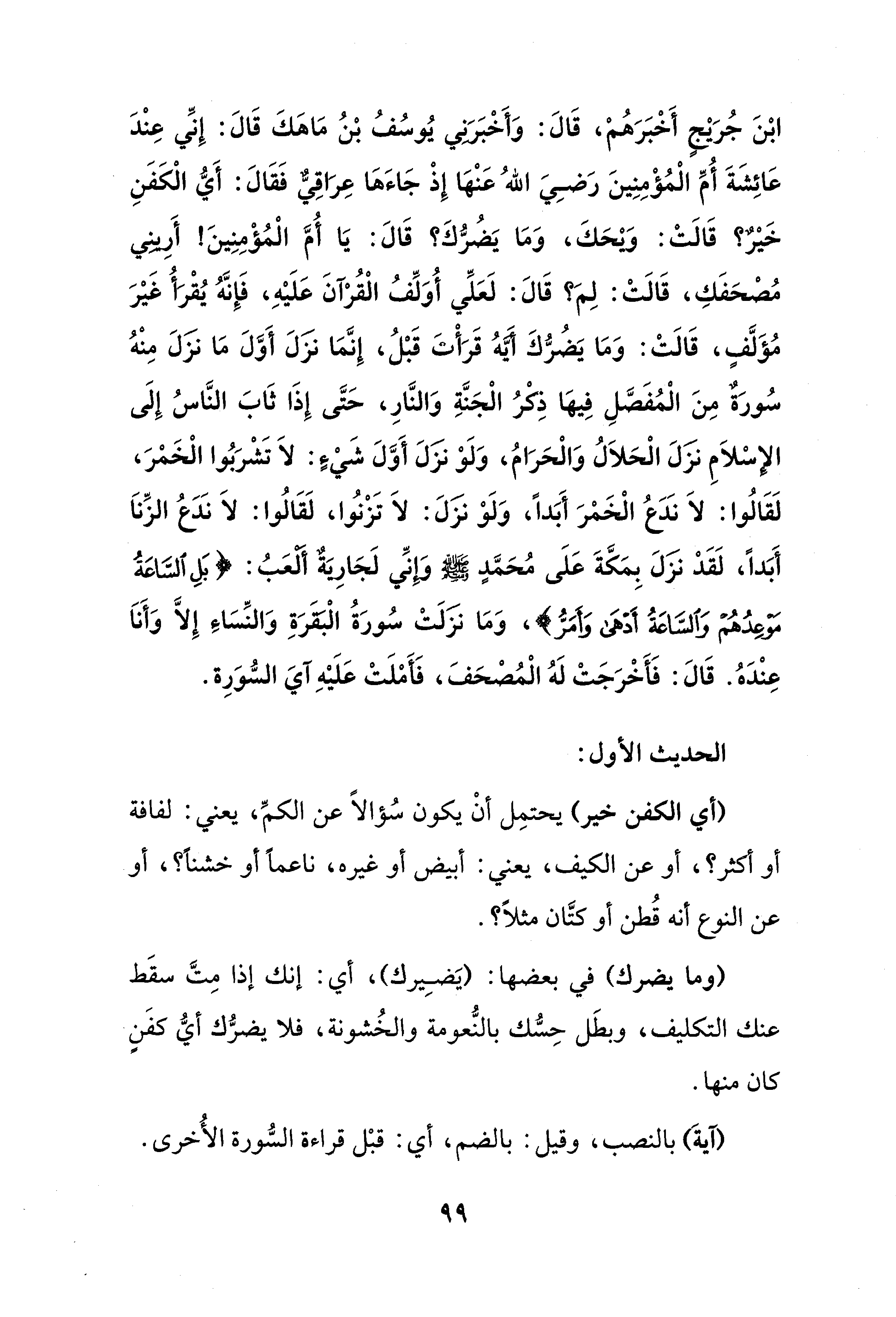 ابْنَ جُرَيْجٍ أَخْبَرَهُمْ، قَالَ: وَأَخْبَرَنِي يُوسُفُ بْنُ مَاهَكَ قَالَ: إِنِّي عِنْدَ عَائِشَةَ أُمِّ الْمُؤْمِنِينَ رَضِيَ اللهُ عَنْهَا إِذْ جَاءَهَا عِرَاقِيٌّ فَقَالَ: أَيُّ الْكَفَنِ خَيرٌ؟ قَالَتْ: وَيْحَكَ، وَمَا يَضُرُّكَ؟ قَالَ: يَا أُمَّ الْمُؤْمِنِينَ! أَرِينِي مُصْحَفَكِ، قَالَتْ: لِمَ؟ قَالَ: لَعَلِّي أُوَلِّفُ الْقُرْآنَ عَلَيْهِ، فَإِنَّهُ يُقْرَأُ غَيْرَ مُؤَلَّفٍ، قَالَتْ: وَمَا يَضُرُّكَ أَيَّهُ قَرَأْتَ قَبْلُ، إِنَّمَا نزَلَ أَوَّلَ مَا نزَلَ مِنْهُ سُورَةٌ مِنَ الْمُفَصَّلِ فِيهَا ذِكْرُ الْجَنَّةِ وَالنَّارِ، حَتَّى إِذَا ثَابَ النَّاسُ إِلَى الإِسْلاَمِ نزَلَ الْحَلاَلُ وَالْحَرَامُ، وَلَوْ نزَلَ أَوَّلَ شَيْءٍ: لَا تَشْرَبُوا الْخَمْرَ، لَقَالُوا: لَا نَدَع الْخَمْرَ أَبَدًا، وَلَوْ نزَلَ: لَا تَزْنُوا، لَقَالُوا: لَا نَدَع الزِّنَا أَبَدًا، لَقَدْ نزَلَ بِمَكَّةَ عَلَى مُحَمَّدٍ - صلى الله عليه وسلم - وَإِنِّي لَجَارِيَةٌ أَلْعَبُ: {بَلِ السَّاعَةُ مَوْعِدُهُمْ وَالسَّاعَةُ أَدْهَى وَأَمَرُّ}، وَمَا نزَلَتْ سُورَةُ الْبَقَرَةِ وَالنِّسَاءِ إِلَّا وَأَنَا عِنْدَهُ. قَالَ: فأَخْرَجَتْ لَهُ الْمُصْحَفَ، فَأَمْلَتْ عَلَيْهِ آيَ السُّوَرِة.