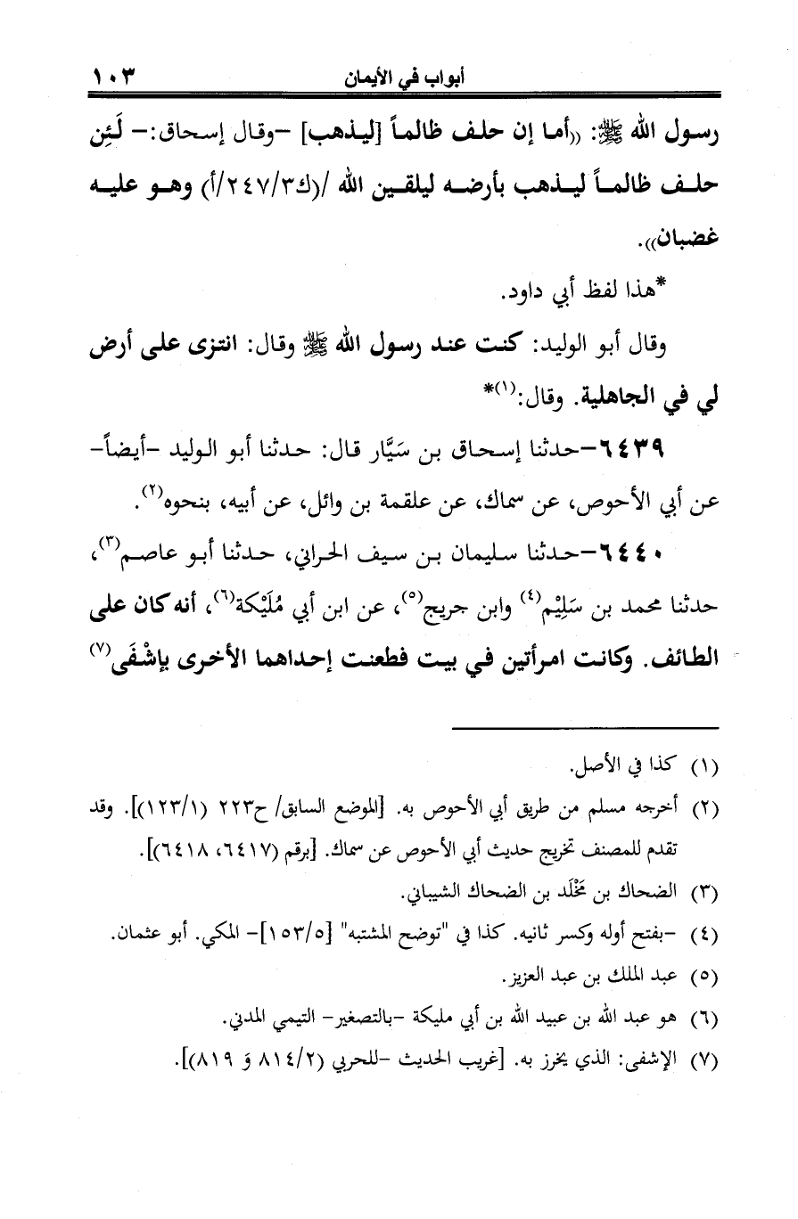 6439 - حدثنا إسحاق بن سَيَّار قال: حدثنا أبو الوليد -أيضًا- عن أبي الأحوص، عن سماك، عن علقمة بن وائل، عن أبيه، بنحوه (¬1).