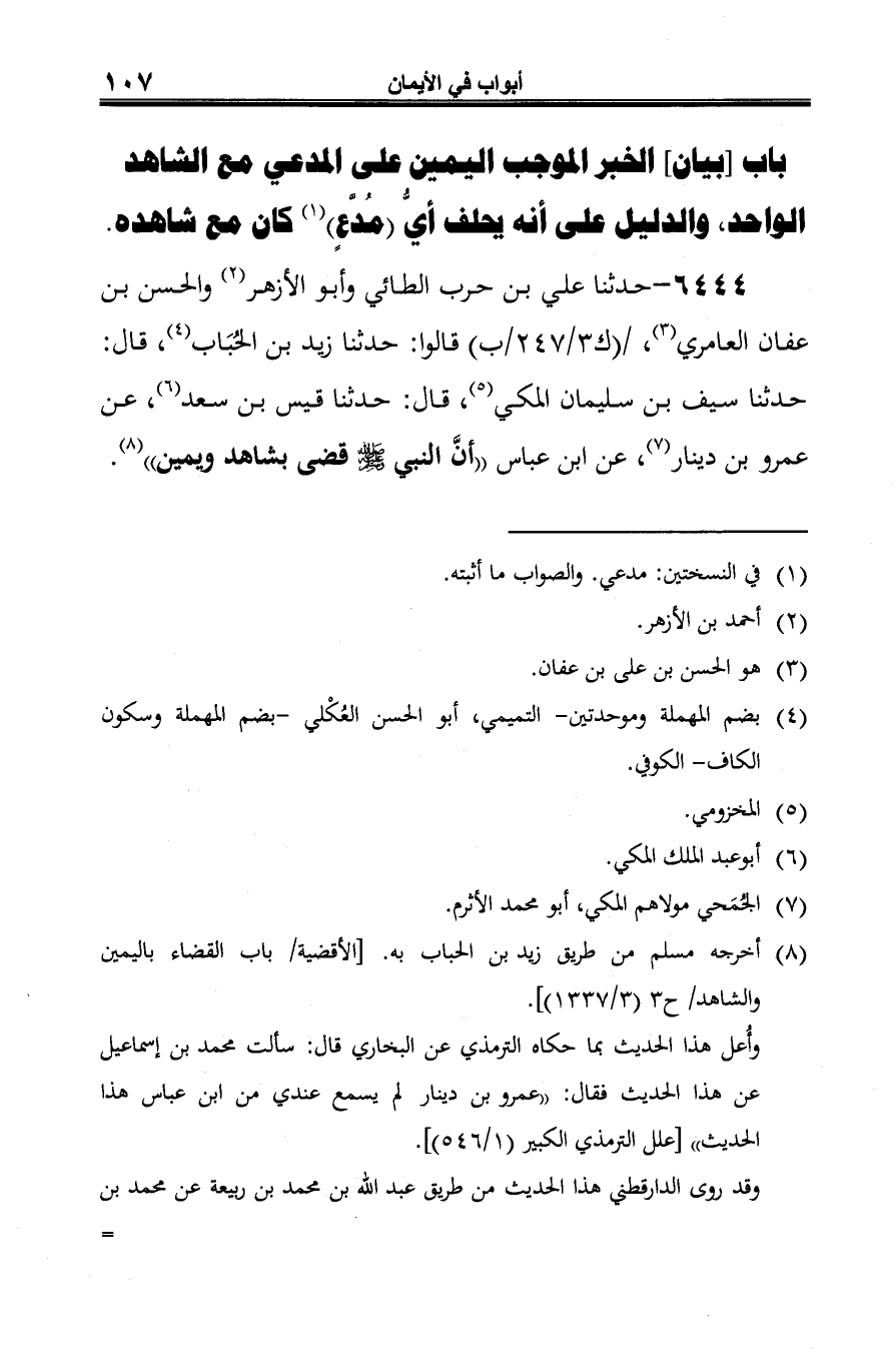 6444 - حدثنا علي بن حرب الطائي وأبو الأزهر (¬1) والحسن بن عفان العامري (¬2)، قالوا: حدثنا زيد بن الحُبَاب (¬3)، قال: حدثنا سيف بن سليمان المكي (¬4)، قال: حدثنا قيس بن سعد (¬5)، عن عمرو بن دينار (¬6)، عن ابن عباس "أنَّ النبي -صلى الله عليه وسلم- قضى بشاهد ويمين" (¬7).