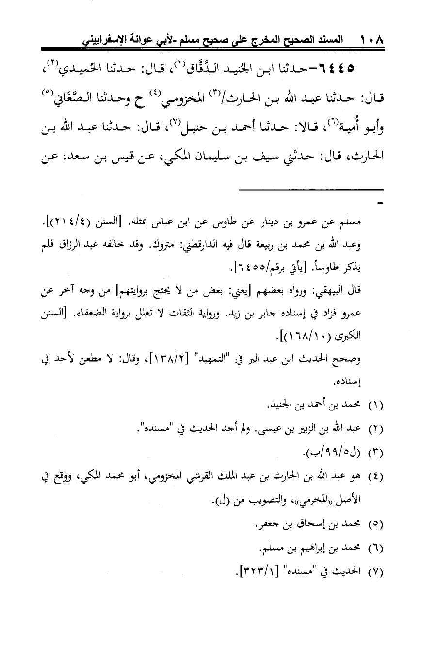 6445 - حدثنا ابن الجُنيد الدَّقَّاق (¬1)، قال: حدثنا الحُميدي (¬2)، قال: حدثنا عبد الله بن الحارث / (¬3) المخزومي (¬4) ح وحدثنا الصَّغَاني (¬5) وأبو أُمية (¬6)، قالا: حدثنا أحمد بن حنبل (¬7)، قال: حدثنا عبد الله بن الحارث، قال: حدثني سيف بن سليمان المكي، عن قيس بن سعد، عن