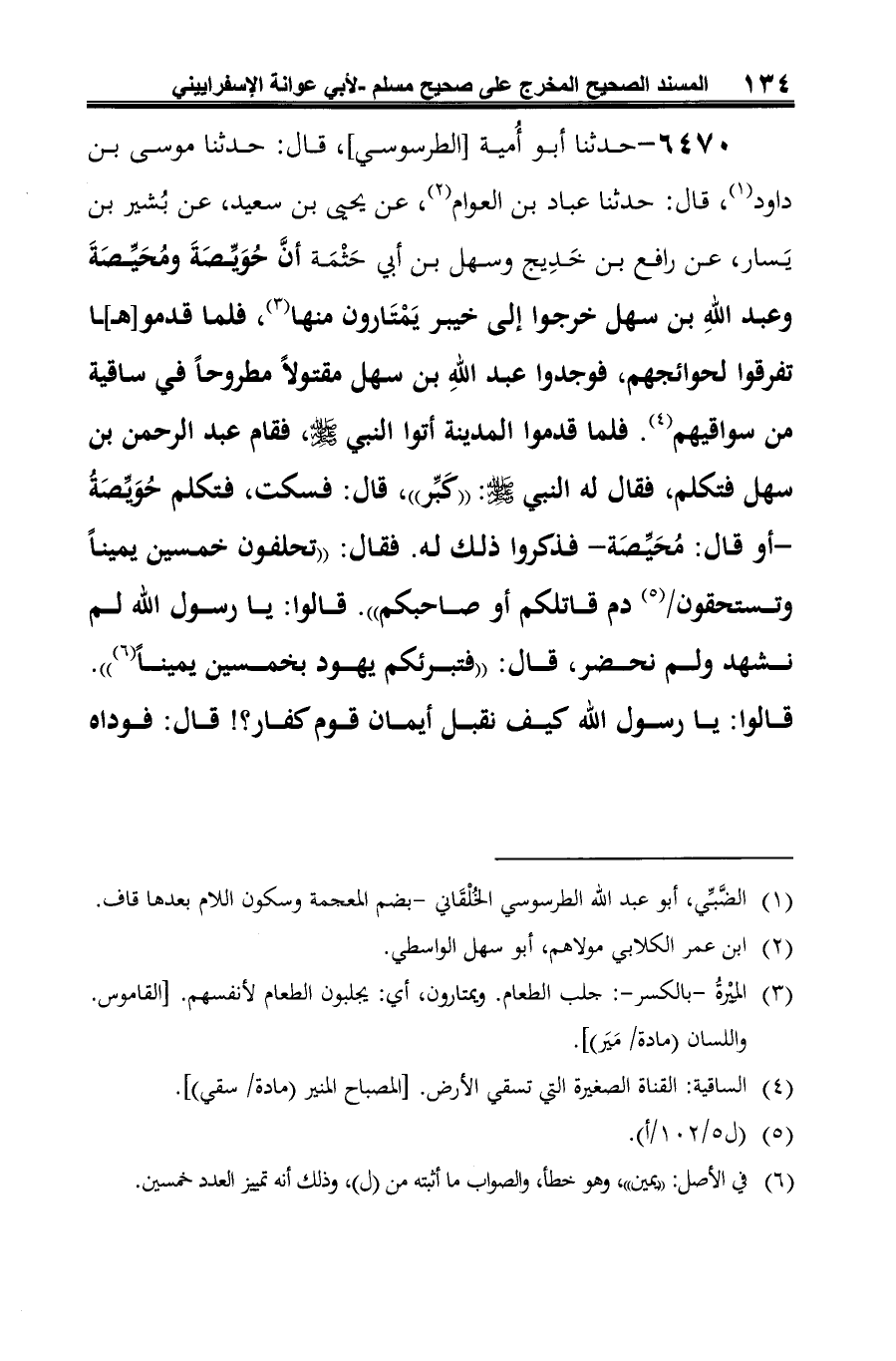 6470 - حدثنا أبو أُمية [الطرسوسي]، قال: حدثنا موسى بن داود (¬1)، قال: حدثنا عباد بن العوام (¬2)، عن يحيى بن سعيد، عن بُشير بن يَسار، عن رافع بن خَدِيج وسهل بن أبي حَثْمَة أنَّ حُوَيِّصَةَ ومُحَيِّصَةَ وعبد اللهِ بن سهل خرجوا إلى خيبر يَمْتارون منها (¬3)، فلما قدمو [هـ]ـا تفرقوا لحوائجهم، فوجدوا عبد اللهِ بن سهل مقتولًا مطروحًا في ساقية من سواقيهم (¬4). فلما قدموا المدينة أتوا النبي -صلى الله عليه وسلم-، فقام عبد الرحمن بن سهل فتكلم، فقال له النبي -صلى الله عليه وسلم-: "كَبِّر"، قال: فسكت، فتكلم حُوَيِّصَةُ -أو قال: مُحَيِّصَة- فذكروا ذلك له. فقال: "تحلفون خمسين يمينًا وتستحقون / (¬5) دم قاتلكم أو صاحبكم". قالوا: يا رسول الله لم نشهد ولم نحضر، قال: "فتبرئكم يهود بخمسين يمينًا (¬6) ".