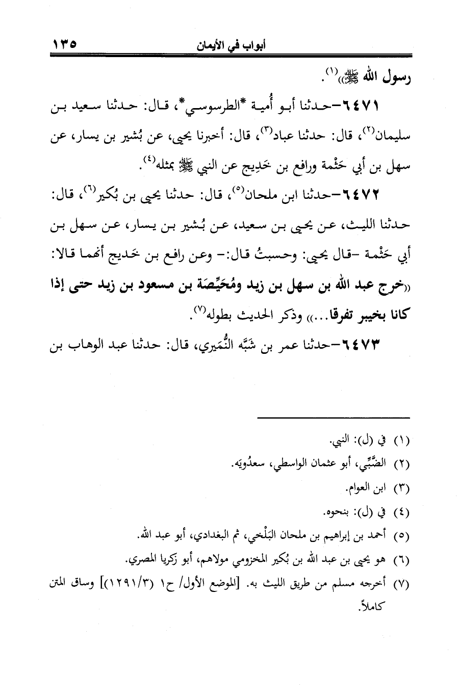 6471 - حدثنا أبو أُمية *الطرسوسي*، قال: حدثنا سعيد بن سليمان (¬1)، قال: حدثنا عباد (¬2)، قال: أخبرنا يحيى، عن بُشير بن يسار، عن سهل بن أبي حَثْمة ورافع بن خَدِيج عن النبي -صلى الله عليه وسلم- بمثله (¬3).