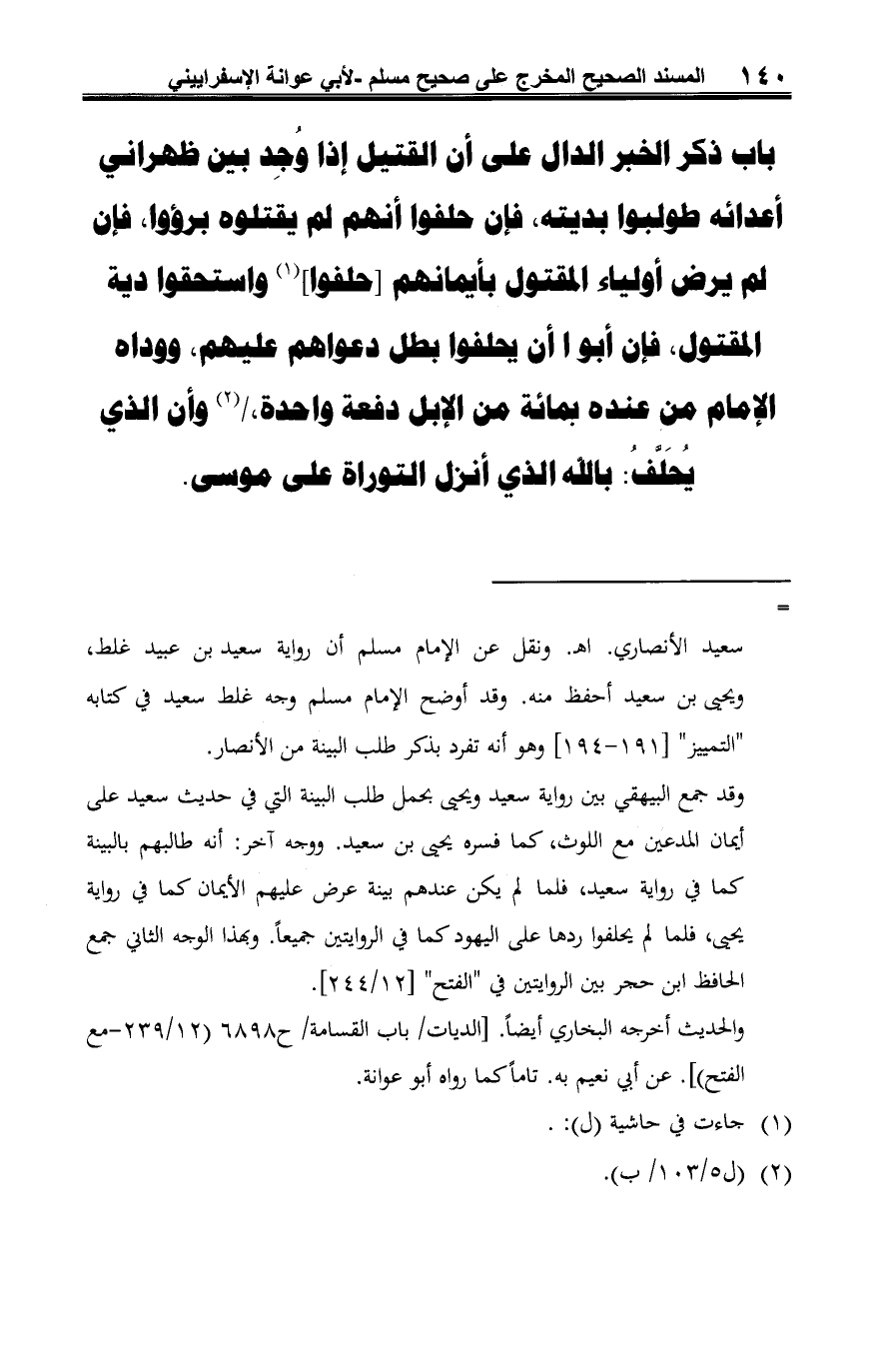 باب ذكر الخبر الدال على أن القتيل إذا وُجِد بين ظهراني أعدائه طولبوا بديته، فإن حلفوا أنهم لم يقتلوه برؤوا، فإن لم يرض أولياء المقتول بأيمانهم [حلفوا] (¬1) واستحقوا دية المقتول، فإن أبوا أن يحلفوا بطل دعواهم عليهم، ووداه الإمام من عنده بمائة من الإبل دفعة واحدة، / (¬2) وأن الذي يُحَلَّفُ: بالله الذي أنزل التوراة على موسى.