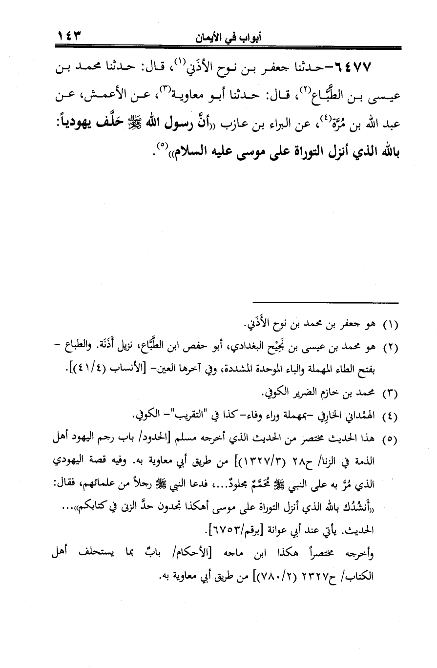 6477 - حدثنا جعفر بن نوح الأذَني (¬1)، قال: حدثنا محمَّد بن عيسى بن الطَّبَّاع (¬2)، قال: حدثنا أبو معاوية (¬3)، عن الأعمش، عن عبد الله بن مُرَّة (¬4)، عن البراء بن عازب "أنَّ رسول الله -صلى الله عليه وسلم- حَلَّف يهوديًّا: بالله الذي أنزل التوراة على موسى عليه السلام" (¬5).