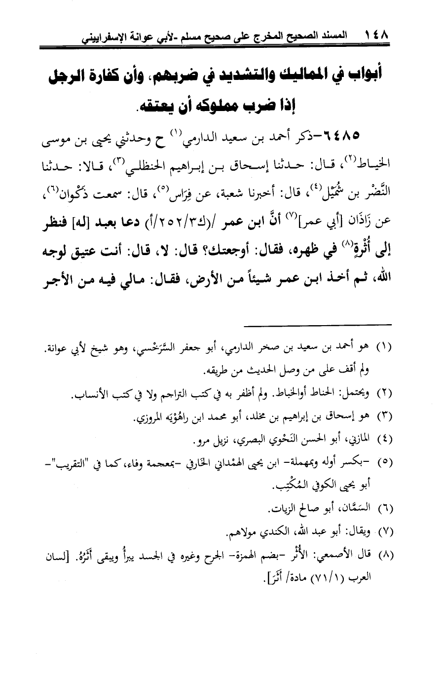 6485 - ذكر أحمد بن سعيد الدارمي (¬1) ح وحدثني يحيى بن موسى الخياط (¬2)، قال: حدثنا إسحاق بن إبراهيم الحنظلي (¬3)، قالا: حدثنا النَّضْر بن شُمَيْل (¬4)، قال: أخبرنا شعبة، عن فِرَاس (¬5)، قال: سمعت ذَكْوان (¬6)، عن زَاذَان [أبي عمر] (¬7) أنَّ ابن عمر دعا بعبد [له] فنظر إلى أُثْرةٍ (¬8) في ظهره، فقال: أوجعتك؟ قال: لا، قال: أنت عتيق لوجه الله، ثمَّ أخذ ابن عمر شيئًا من الأرض، فقال: ما لي فيه من الأجر