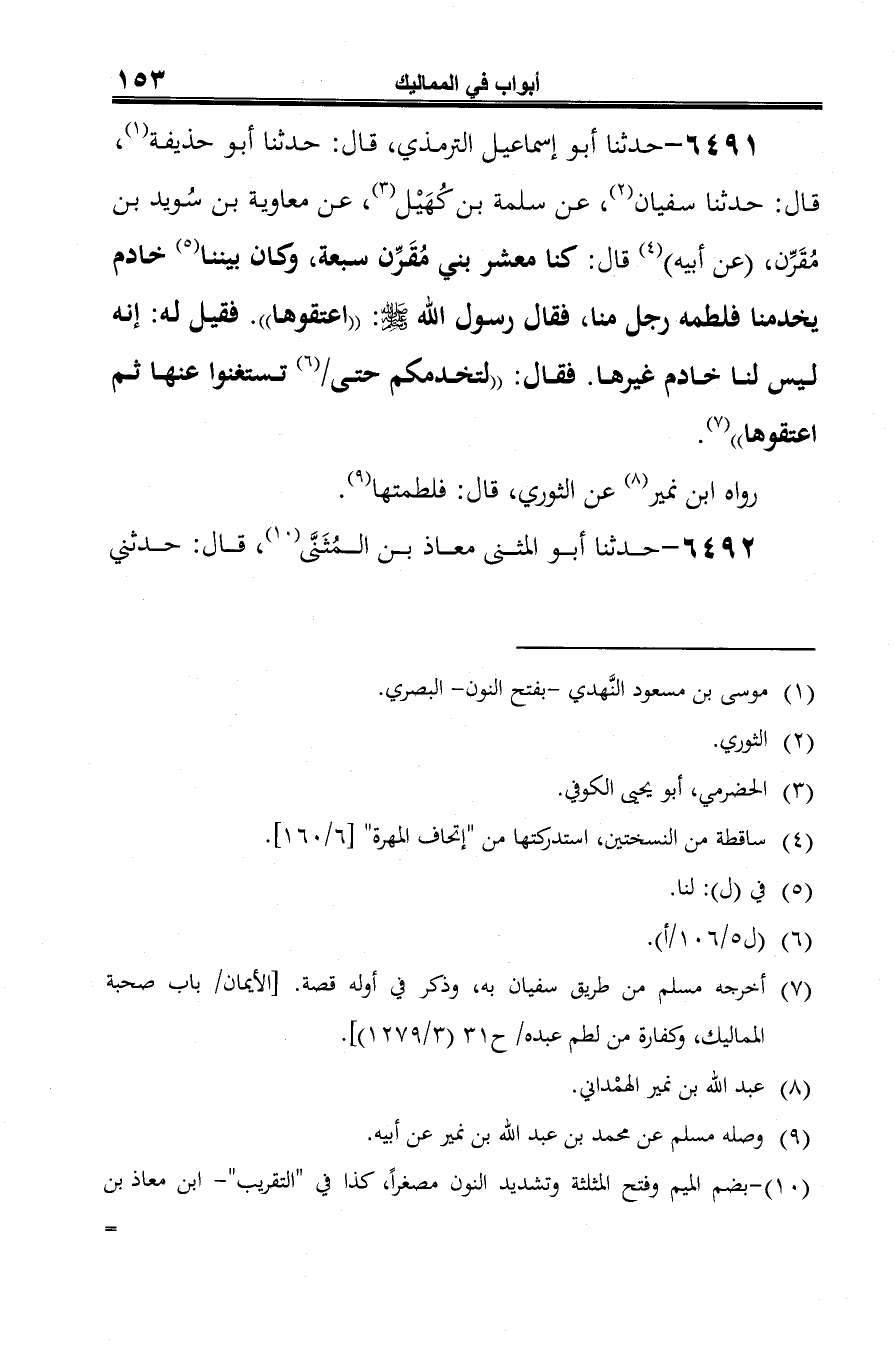 6491 - حدثنا أبو إسماعيل الترمذي، قال: حدثنا أبو حذيفة (¬1)، قال: حدثنا سفيان (¬2)، عن سلمة بن كُهَيْل (¬3)، عن معاوية بن سُويد بن مُقَرِّن، (عن أبيه) (¬4) قال: كنا معشر بني مُقَرِّن سبعة، وكان بيننا (¬5) خادم يخدمنا فلطمه رجل منا، فقال رسول الله -صلى الله عليه وسلم-: "اعتقوها". فقيل له: إنه ليس لنا خادم غيرها. فقال: "لتخدمكم حتى / (¬6) تستغنوا عنها ثمَّ اعتقوها" (¬7).