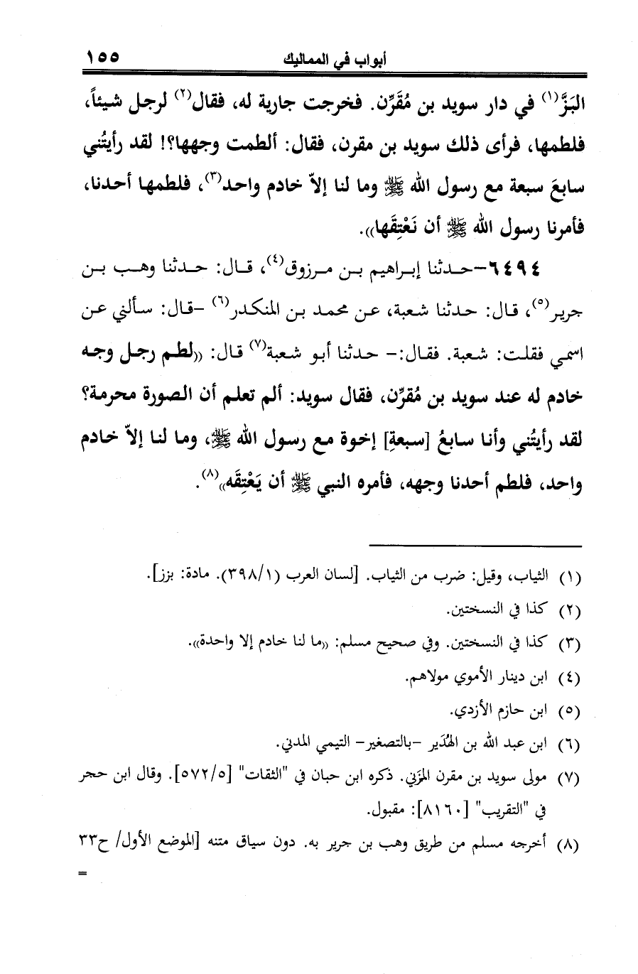 6494 - حدثنا إبراهيم بن مرزوق (¬1)، قال: حدثنا وهب بن جرير (¬2)، قال: حدثنا شعبة، عن محمَّد بن المنكدر (¬3) - قال: سألني عن اسمي فقلت: شعبة. فقال: - حدثنا أبو شعبة (¬4) قال: "لطم رجل وجه خادم له عند سويد بن مُقرِّن، فقال سويد: ألم تعلم أن الصورة محرمة؟ لقد رأيتُني وأنا سابعُ [سبعةِ] إخوة مع رسول الله -صلى الله عليه وسلم-، وما لنا إلَّا خادم واحد، فلطم أحدنا وجهه، فأمره النبي -صلى الله عليه وسلم- أن يَعْتِقَه" (¬5).
