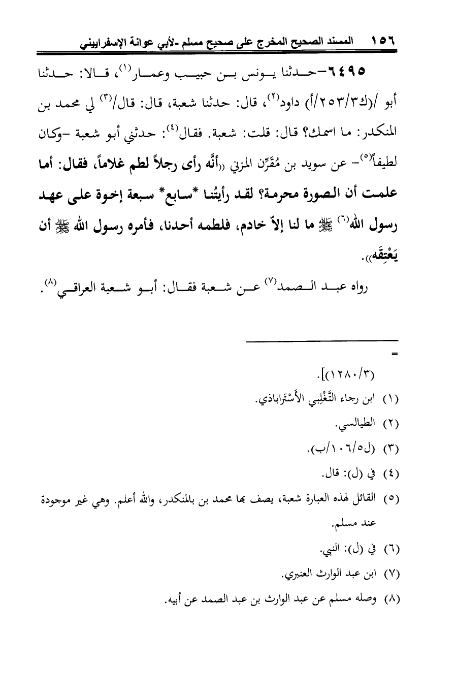 6495 - حدثنا يونس بن حبيب وعمار (¬1)، قالا: حدثنا أبو داود (¬2)، قال: حدثنا شعبة، قال: قال / (¬3) لي محمَّد بن المنكدر: ما اسمك؟ قال: قلت: شعبة. فقال (¬4): حدثني أبو شعبة -وكان لطيفًا (¬5) - عن سويد بن مُقَرِّن المزني "أنَّه رأى رجلًا لطم غلامًا، فقال: أما علمت أن الصورة محرمة؟ لقد رأيتُنا *سابع* سبعة إخوة على عهد رسول الله (¬6) -صلى الله عليه وسلم- ما لنا إلَّا خادم، فلطمه أحدنا، فأمره رسول الله -صلى الله عليه وسلم- أن يَعْتِقَه".