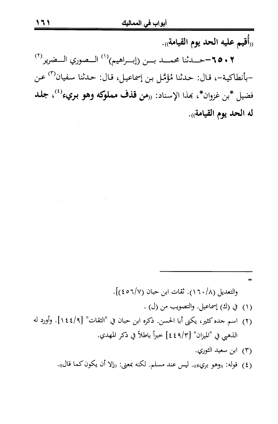 6502 - حدثنا محمَّد بن (إبراهيم) (¬1) الصوري الضرير (¬2) -بأنطاكية-، قال: حدثنا مُؤَمَّل بن إسماعيل، قال: حدثنا سفيان (¬3) عن فضيل *بن غزوان*، بهذا الإسناد: "من قذف مملوكه وهو بريء (¬4)، جلد له الحد يوم القيامة".