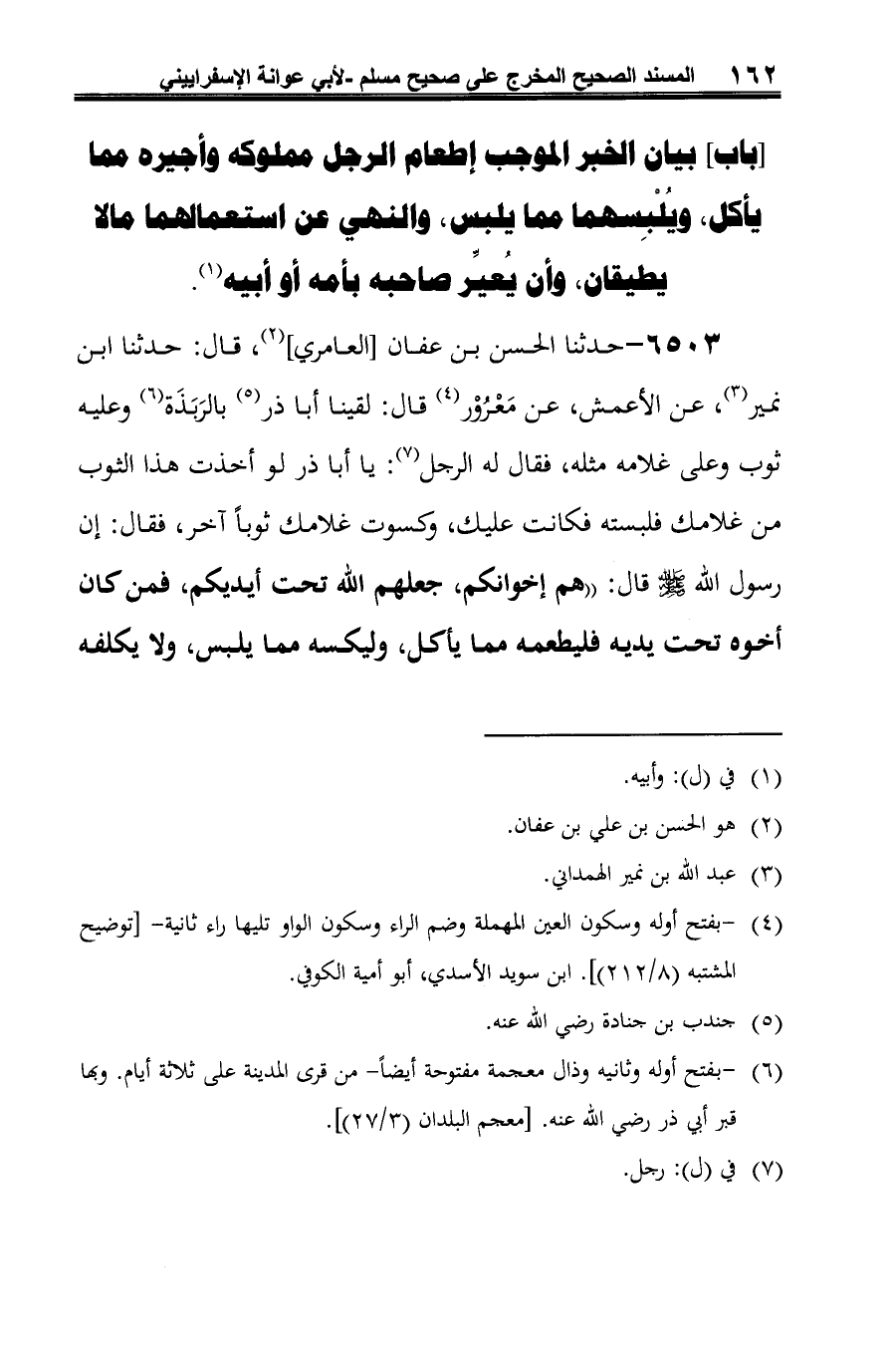 6503 - حدثنا الحسن بن عفان [العامري] (¬1)، قال: حدثنا ابن نمير (¬2)، عن الأعمش، عن مَعْرُوْر (¬3) قال: لقينا أبا ذر (¬4) بالرَبَذَة (¬5) وعليه ثوب وعلى غلامه مثله، فقال له الرجل (¬6): يا أبا ذر لو أخذت هذا الثوب من غلامك فلبسته فكانت عليك، وكسوت غلامك ثوبًا آخر، فقال: إن رسول الله -صلى الله عليه وسلم- قال: "هم إخوانكم، جعلهم الله تحت أيديكم، فمن كان أخوه تحت يديه فليطعمه مما يأكل، وليكسه مما يلبس، ولا يكلفه
