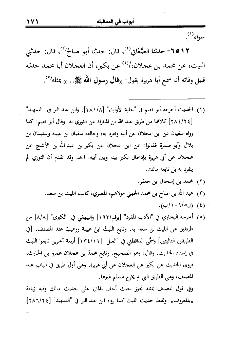(¬4) أخرجه البخاري في "الأدب المفرد" [برقم / 193] والبيهقيُّ في "الكبرى" [8/ 8] من طريقين عن الليث بن سعد به. وتابع الليثَ ابنُ عيينة ووهيبٌ عند المصنف. [في الطريقين التاليتين] وسمَّى الدارقطني في "العلل" [11/ 134] أربعة أخرين تابعوا الليث في إسناد الحديث. وقال: وهو الصحيح. وتابع محمدَ بن عجلان عمرو بن الحارث، فروى الحديث عن بكير عن العجلان عن أبي هريرة. وهي أول طريق في الباب عند المصنف، وهي الطريق التي لم يخرج مسلم غيرها.