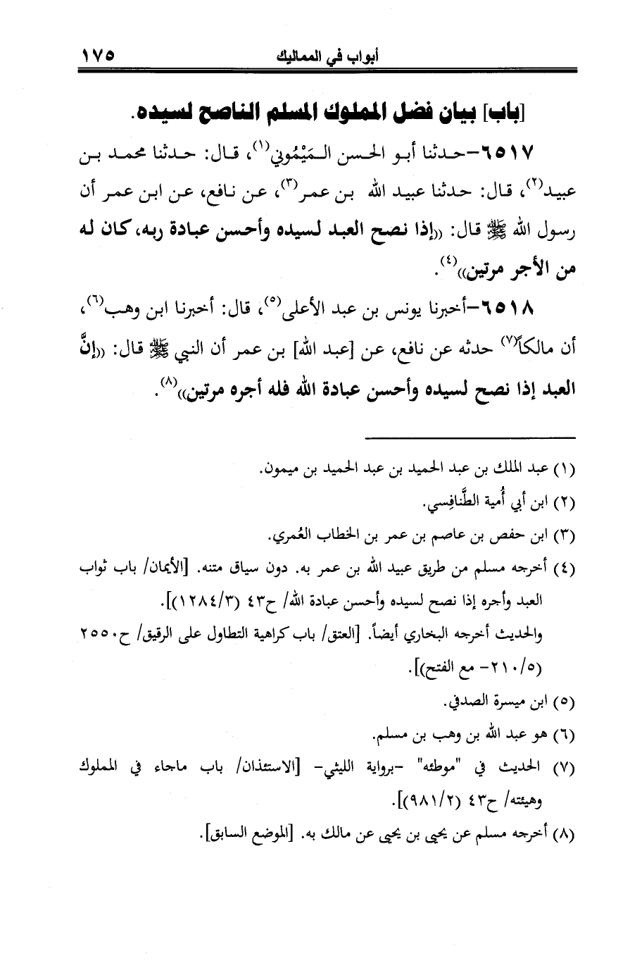 6517 - حدثنا أَبو الحسن المَيْمُوني (¬1)، قال: حدثنا محمد بن عبيد (¬2)، قال: حدثنا عبيد الله بن عمر (¬3)، عن نافع، عن ابن عمر أن رسول الله -صلى الله عليه وسلم- قال: "إذا نصح العبد لسيده وأحسن عبادة ربه، كان له من الأجر مرتين" (¬4).