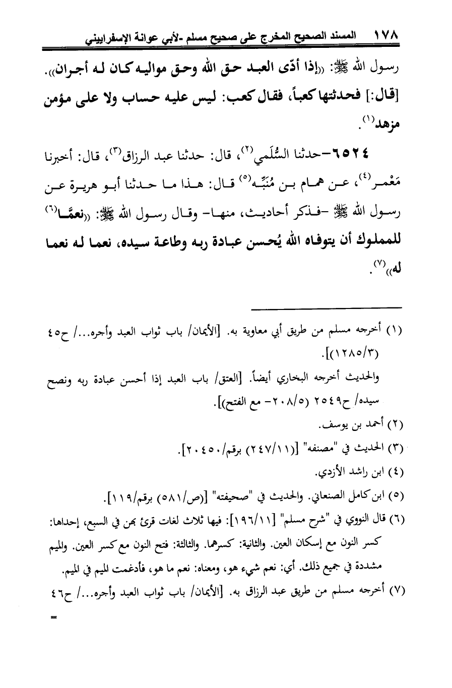 6524 - حدثنا السُّلَمي (¬1)، قال: حدثنا عبد الرزاق (¬2)، قال: أخبرنا مَعْمر (¬3)، عن همام بن مُنَبِّه (¬4) قال: هذا ما حدثنا أَبو هريرة عن رسول الله -صلى الله عليه وسلم- فذكر أحاديث، منها- وقال رسول الله -صلى الله عليه وسلم-: "نعمَّا (¬5) للمملوك أن يتوفاه الله يُحسن عبادة ربه وطاعة سيده، نعما له نعما له" (¬6).