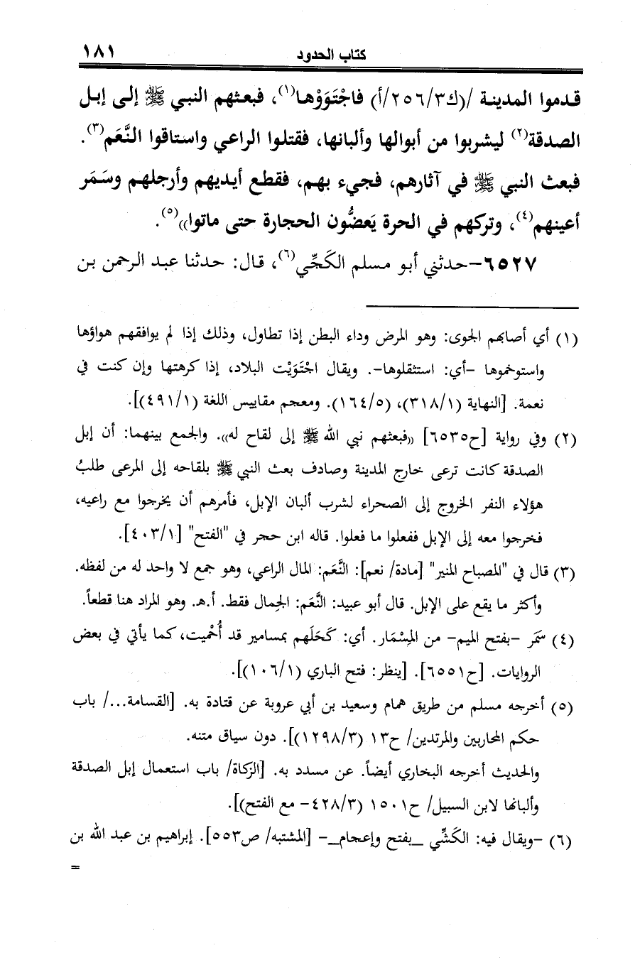 -[182]- حماد الشُّعَيْثِي (¬2)، قال: حدثنا سعيد بن أبي عروبة، عن قتادة، عن أنس بن مالك "أنَّ رَهْطًا (¬3) من عُكْل وعُرينة أتوا رسول الله -صلى الله عليه وسلم- فقالوا: يا رسول الله! إنا كنا أهل ضرع ولم نكن أهل ريف، فاستوخموا المدينة، فأمر لهم رسول الله -صلى الله عليه وسلم- بذودٍ (¬4) أن يخرجوا فيها فيشربوا من ألبانها وأبوالها، فقتلوا راعي رسول الله -صلى الله عليه وسلم- واستاقوا الذود، فبعث رسول الله -صلى الله عليه وسلم- في آثارهم، فأُتي بهم، فقطع أيديهم وأرجلهم، وسَمَل (¬5) أعينهم، وتركهم في الحرة حتى ماتوا".
