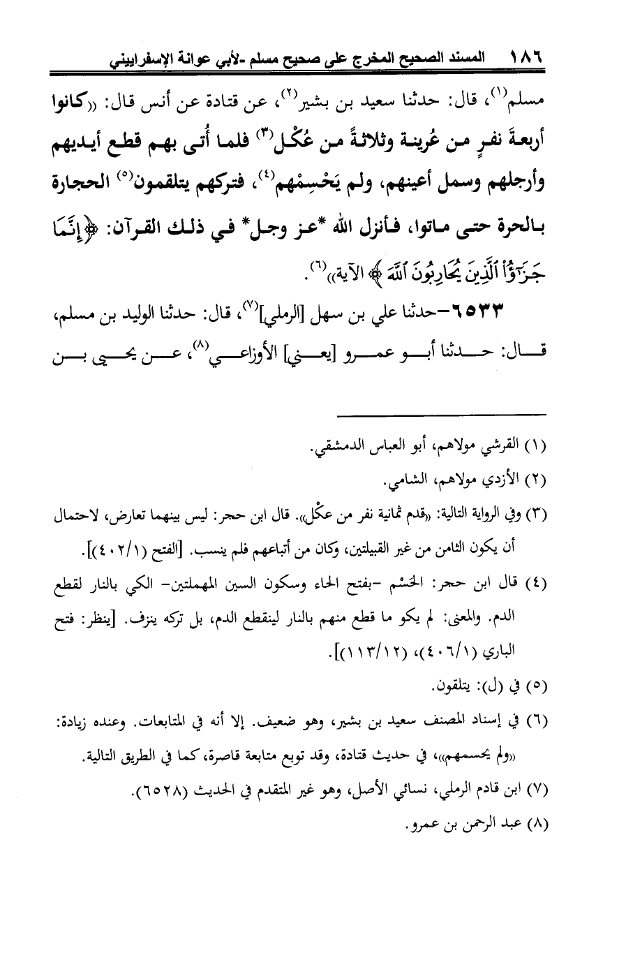 -[187]- أبي كثير (¬3)، عن أبي قِلاَبة الجَرْمي (¬4)، عن أنس بن مالك قال: "قدم ثمانية نفر من عُكَل على رسول الله -صلى الله عليه وسلم-، فأسلموا ثم اجْتَوَوا المدينة، فأمرهم رسول الله -صلى الله عليه وسلم- أن يأتوا إبل الصدقة فيشريوا من ألبانها وأبوالها، ففعلوا، فقتلوا راعيها واستاقوا الإبل، فأمر رسول الله -صلى الله عليه وسلم- في أثرهم قافة (¬5)، فأُتي بهم، فقطع أيديهم وأرجلهم وسمل أعينهم. وتركهم فلم يحسمهم حتى ماتوا" (¬6).
