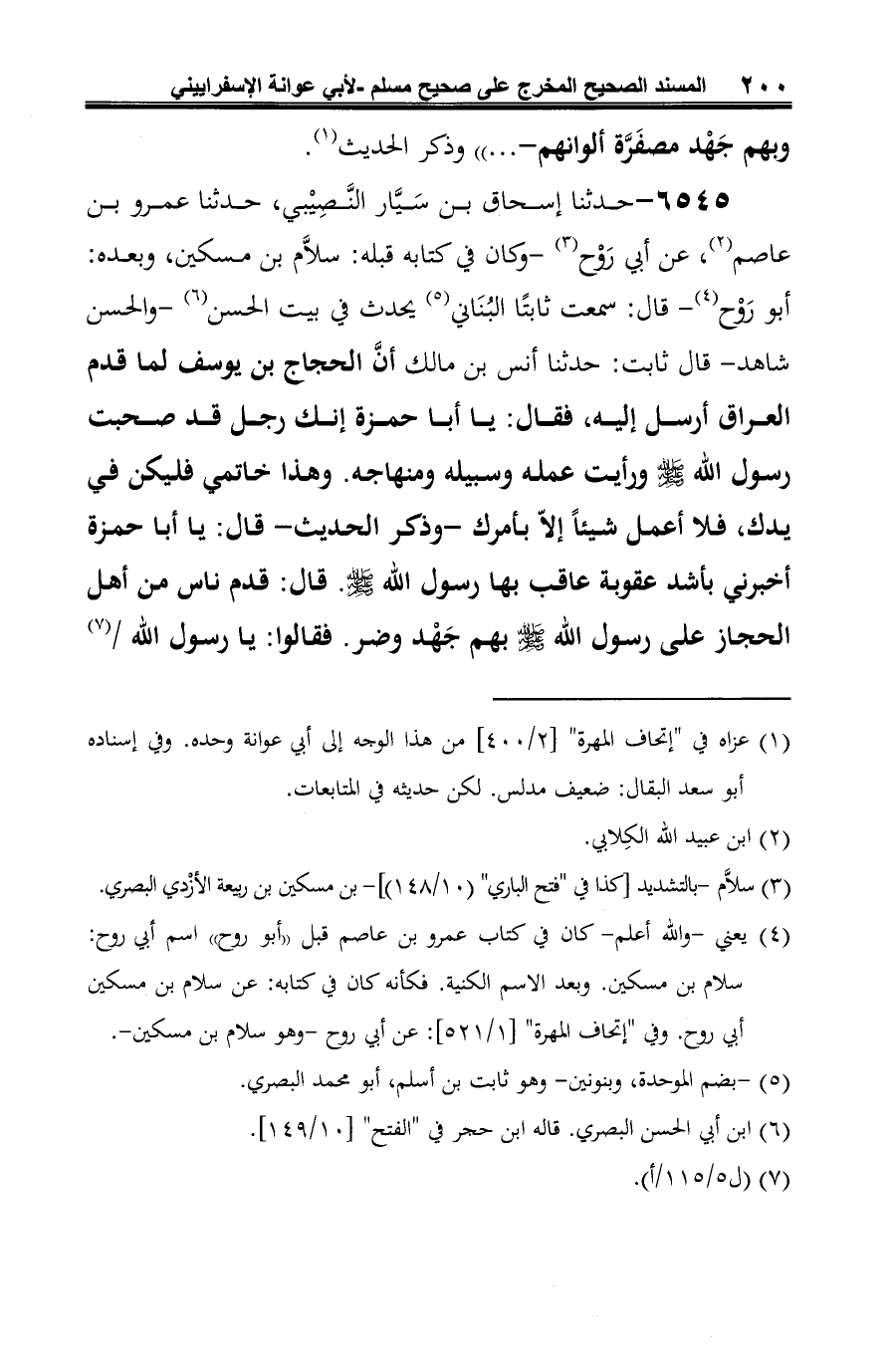 6545 - حدثنا إسحاق بن سَيَّار النَّصِيْبي، حدثنا عمرو بن عاصم (¬1)، عن أبي رَوْح (¬2) -وكان في كتابه قبله: سلَّام بن مسكين، وبعده: أَبو رَوْح (¬3) - قال: سمعت ثابتًا البُنَاني (¬4) يحدث في بيت الحسن (¬5) -والحسن شاهد- قال ثابت: حدثنا أنس بن مالك أنَّ الحجاج بن يوسف لما قدم العراق أرسل إليه، فقال: يا أبا حمزة إنك رجل قد صحبت رسول الله -صلى الله عليه وسلم- ورأيت عمله وسبيله ومنهاجه. وهذا خاتمي فليكن في يدك، فلا أعمل شيئًا إلّا بأمرك -وذكر الحديث- قال: يا أبا حمزة أخبرني بأشد عقوبة عاقب بها رسول الله -صلى الله عليه وسلم-. قال: قدم ناس من أهل الحجاز على رسول الله -صلى الله عليه وسلم- بهم جَهْد وضر. فقالوا: يا رسول الله / (¬6)