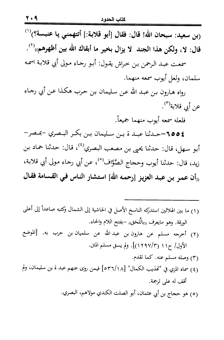 6554 - حدثنا عبدة بن سليمان بن بكر البصري -بمصر- أَبو سهل، قال: حدثنا يحيى بن مصعب البصري (¬1)، قال: حدثنا حماد بن زيد، قال: حدثنا أيوب وحجاج الصَّوَّاف (¬2)، عن أبي رجاء مولى أبي قلابة، "أن عمر بن عبد العزيز [رحمه الله] استشار الناس في القسامة فقال
