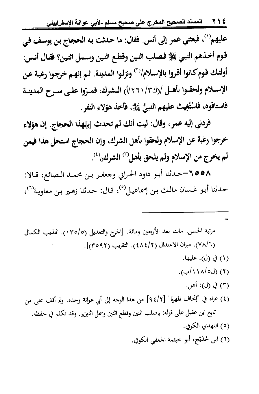 6558 - حدثنا أَبو داود الحراني وجعفر بن محمد الصائغ، قالا: حدثنا أَبو غسان مالك بن إسماعيل (¬1)، قال: حدثنا زهير بن معاوية (¬2)،