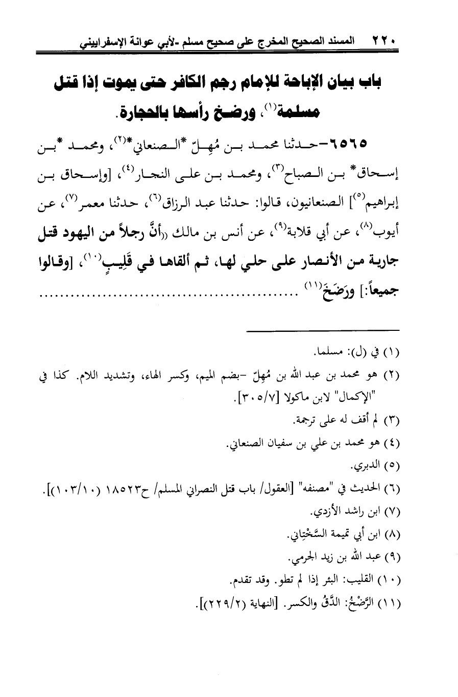 6565 - حدثنا محمد بن مُهِلّ * الصنعاني * (¬1)، ومحمد* بن إسحاق* بن الصباح (¬2)، ومحمد بن علي النجار (¬3)، [وإسحاق بن إبراهيم (¬4)] الصنعانيون، قالوا: حدثنا عبد الرزاق (¬5)، حدثنا معمر (¬6)، عن أيوب (¬7)، عن أبي قلابة (¬8)، عن أنس بن مالك "أنَّ رجلًا من اليهود قتل جارية من الأنصار على حلي لها، ثم ألقاها في قَلِيبٍ (¬9)، [وقالوا جميعًا:] ورَضَخَ (¬10)