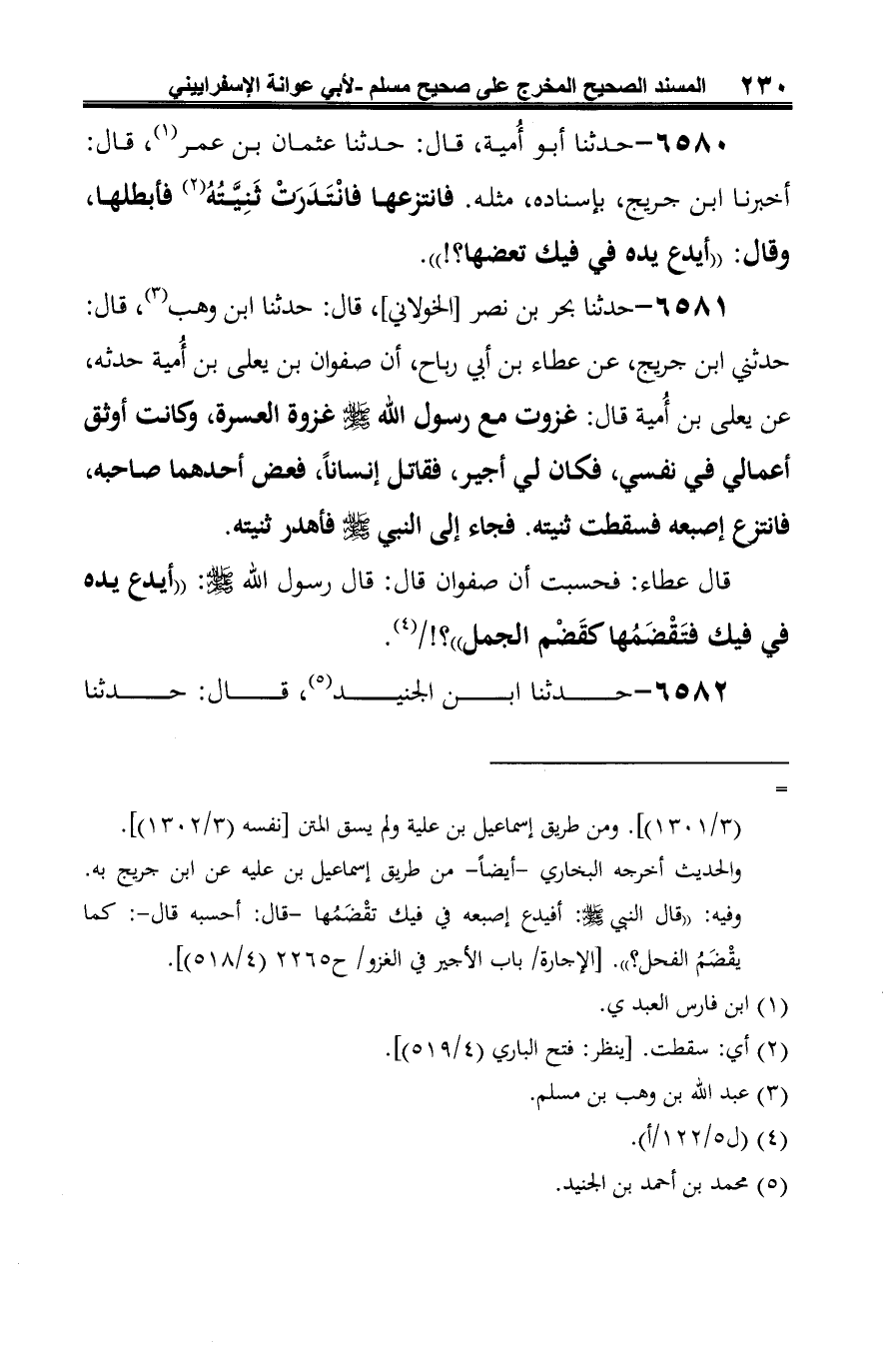 6581 - حدثنا بحر بن نصر [الخولاني]، قال: حدثنا ابن وهب (¬1)، قال: حدثني ابن جريج، عن عطاء بن أبي رباح، أن صفوان بن يعلى بن أُمية حدثه، عن يعلى بن أُمية قال: غزوت مع رسول الله -صلى الله عليه وسلم- غزوة العسرة، وكانت أوثق أعمالي في نفسي، فكان لي أجير، فقاتل إنسانًا، فعض أحدهما صاحبه، فانتزع إصبعه فسقطت ثنيته. فجاء إلى النبي -صلى الله عليه وسلم- فأهدر ثنيته.