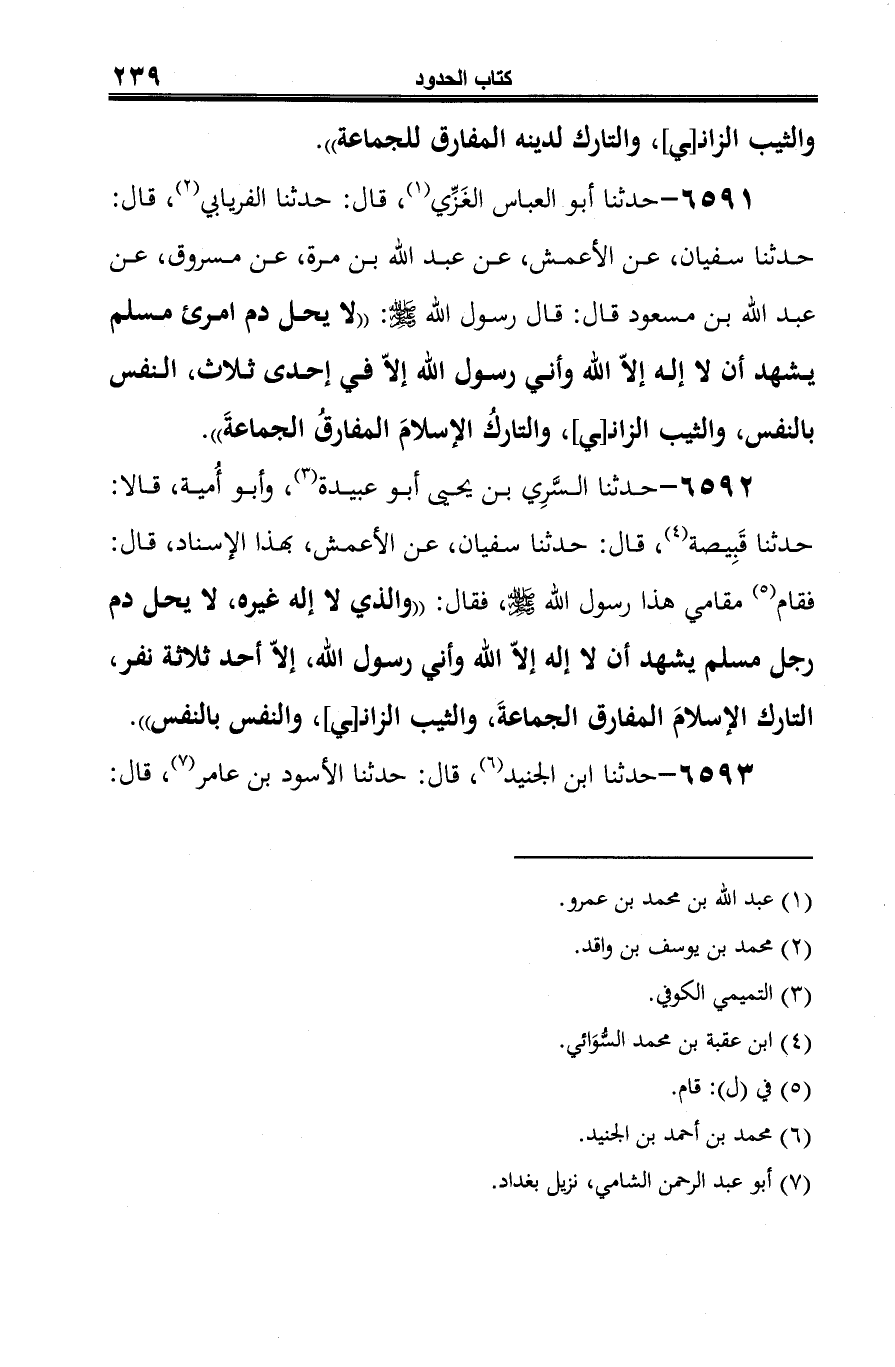6591 - حدثنا أَبو العباس الغَزِّي (¬1)، قال: حدثنا الفريابي (¬2)، قال: حدثنا سفيان، عن الأعمش، عن عبد الله بن مرة، عن مرة، عن مسروق، عن عبد الله بن مسعود قال: قال رسول الله -صلى الله عليه وسلم-: "لا يحل دم امرئ مسلم يشهد أن لا إله إلّا الله وأني رسول الله إلّا في إحدى ثلاث، النفس بالنفس، والثيب الزانـ[ـي]، والتاركُ الإسلامَ المفارقُ الجماعةَ".