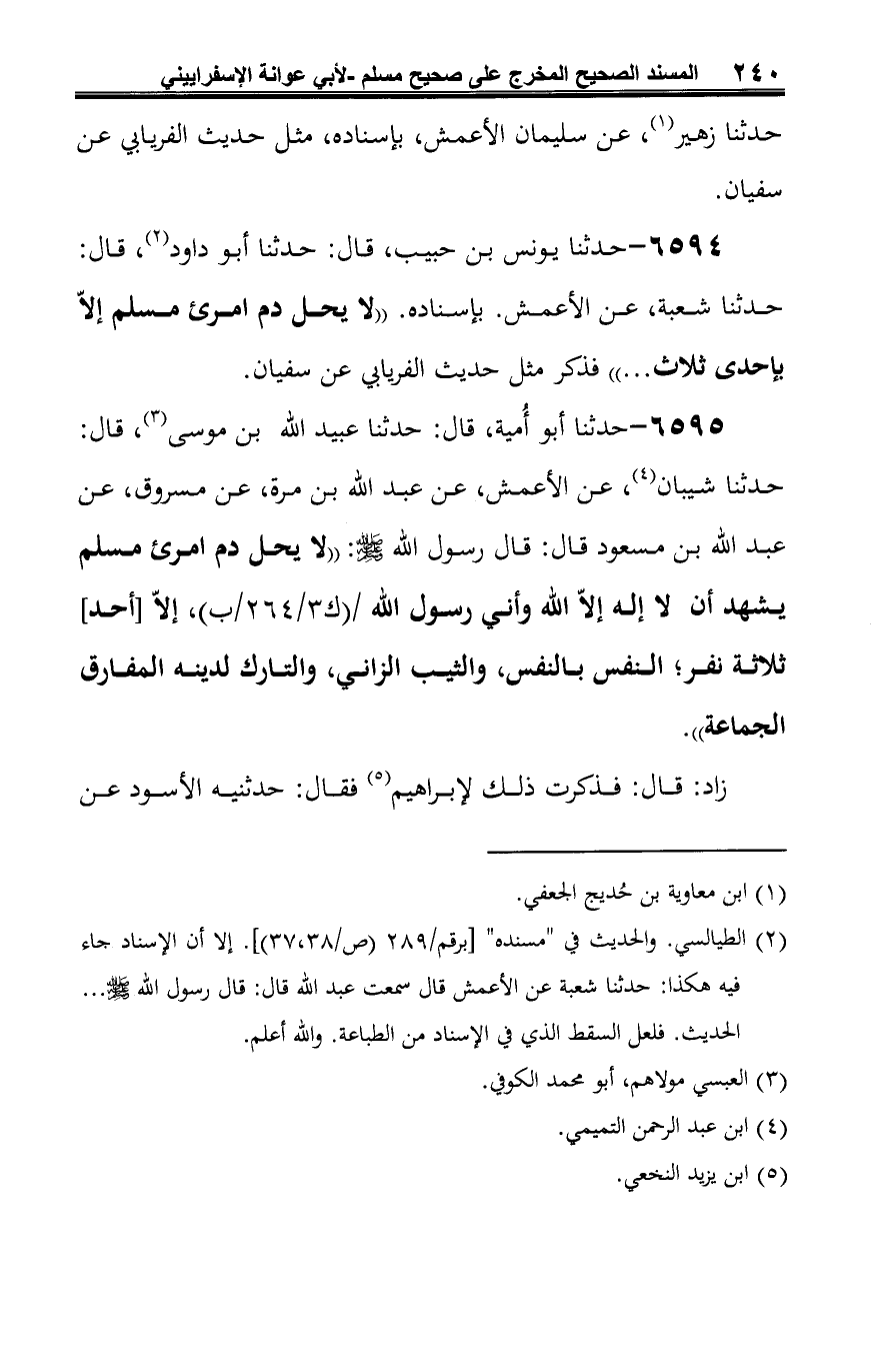 6594 - حدثنا يونس بن حبيب، قال: حدثنا أَبو داود (¬1)، قال: حدثنا شعبة، عن الأعمش. بإسناده. "لا يحل دم امرئ مسلم إلّا بإحدى ثلاث ... " فذكر مثل حديث الفريابي عن سفيان.