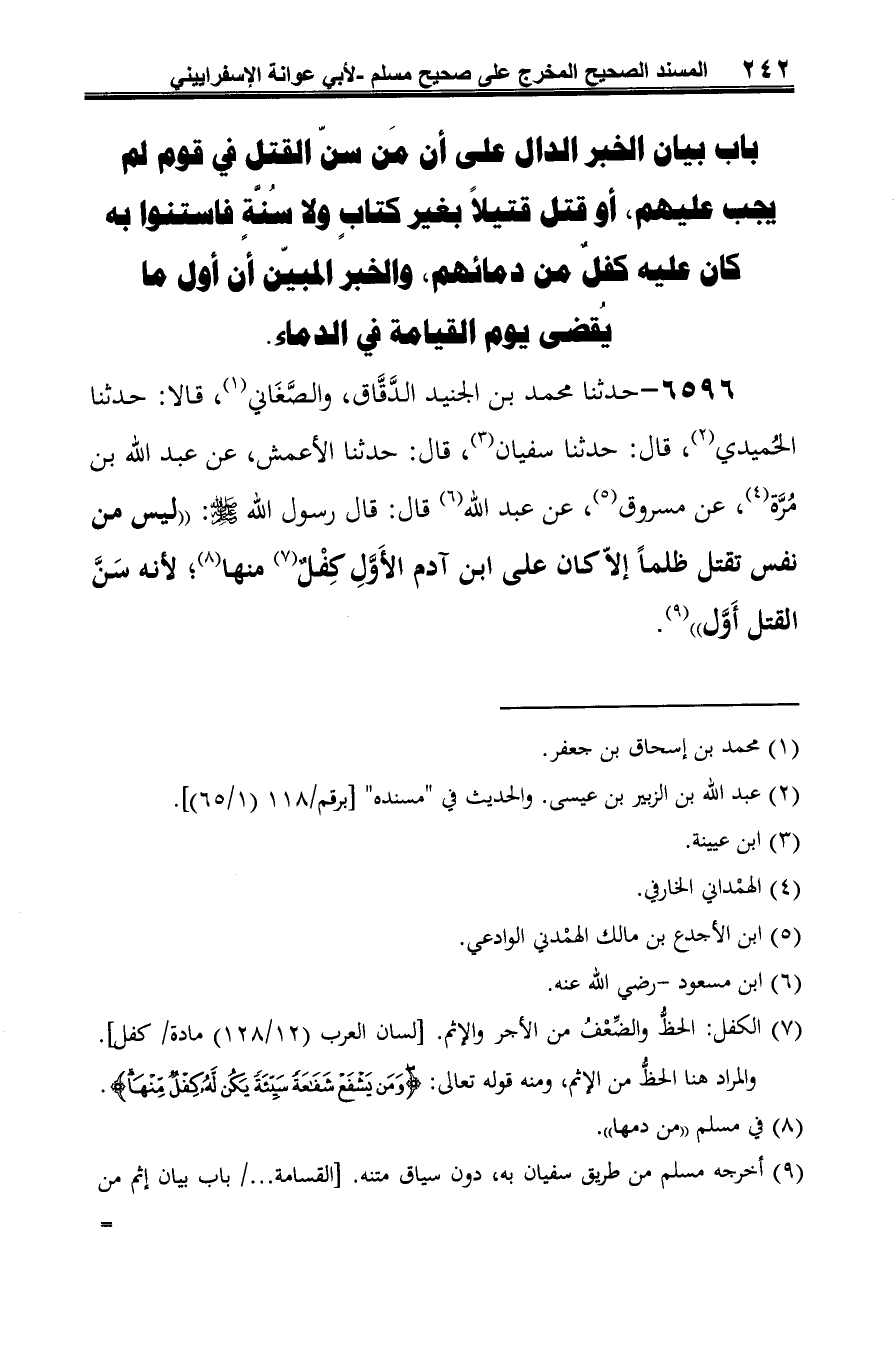 6596 - حدثنا محمد بن الجنيد الدَّقَّاق، والصَّغَاني (¬1)، قالا: حدثنا الحُميدي (¬2)، قال: حدثنا سفيان (¬3)، قال: حدثنا الأعمش، عن عبد الله بن مُرَّة (¬4)، عن مسروق (¬5)، عن عبد الله (¬6) قال: قال رسول الله -صلى الله عليه وسلم-: "ليس من نفس تقتل ظلمًا إلّا كان على ابن آدم الأَوَّلِ كِفْلٌ (¬7) منها (¬8)، لأنه سَنَّ القتل أَوَّل" (¬9).