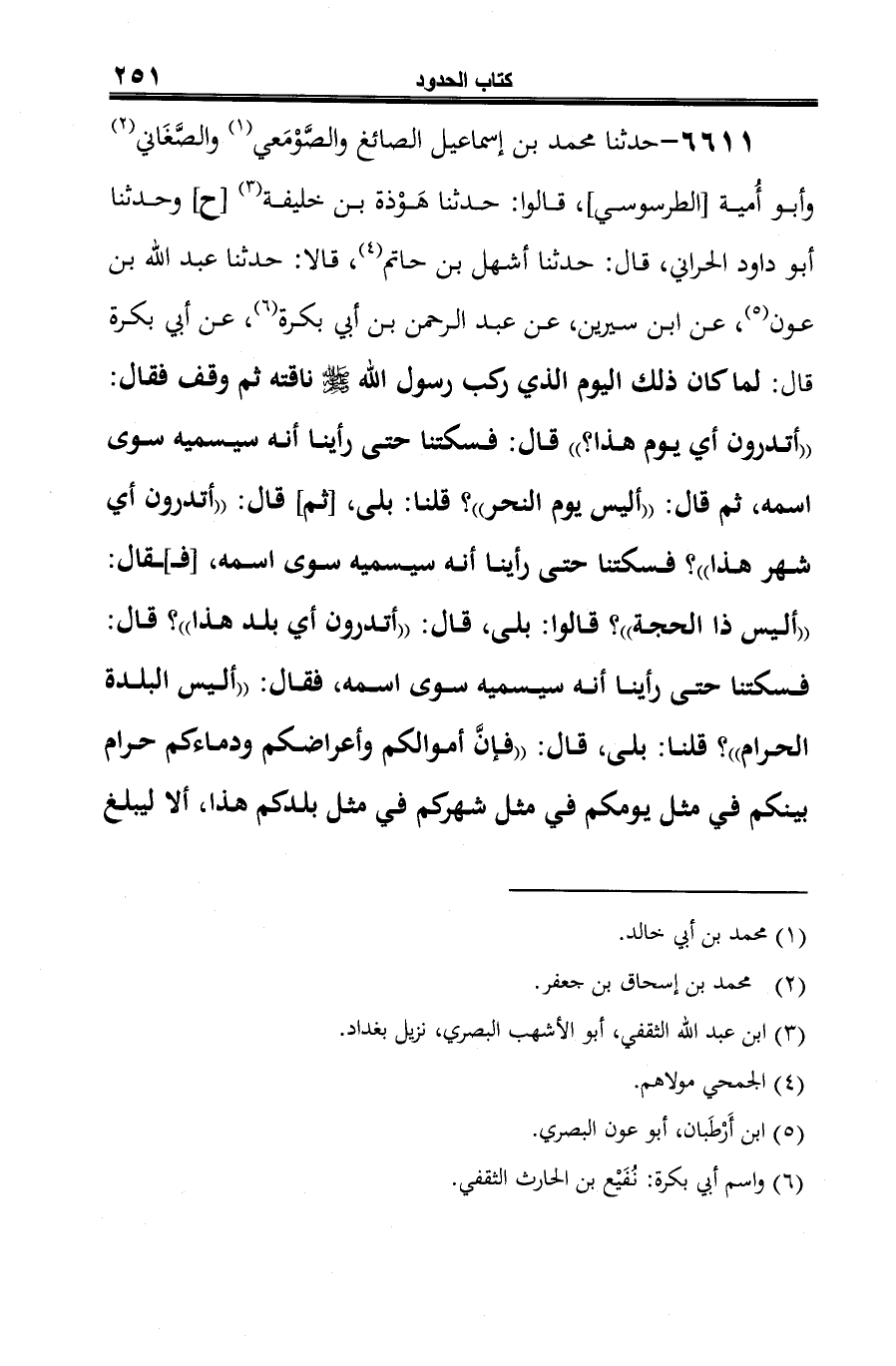 6611 - حدثنا محمد بن إسماعيل الصائغ والصَّوْمَعي (¬1) والصَّغَاني (¬2) وأبو أُمية [الطرسوسي]، قالوا: حدثنا هَوْذة بن خليفة (¬3) [ح] وحدثنا أَبو داود الحراني، قال: حدثنا أشهل بن حاتم (¬4)، قالا: حدثنا عبد الله بن عون (¬5)، عن ابن سيرين، عن عبد الرحمن بن أبي بكرة (¬6)، عن أبي بكرة قال: لما كان ذلك اليوم الذي ركب رسول الله -صلى الله عليه وسلم- ناقته ثم وقف فقال: "أتدرون أي يوم هذا؟ " قال: فسكتنا حتى رأينا أنه سيسميه سوى اسمه، ثم قال: "أليس يوم النحر"؟ قلنا: بلى، [ثم] قال: "أتدرون أي شهر هذا"؟ فسكتنا حتى رأينا أنه سيسميه سوى اسمه،] فـ]ـقال: "أليس ذا الحجة"؟ قالوا: بلى، قال: "أتدرون أي بلد هذا"؟ قال: فسكتنا حتى رأينا أنه سيسميه سوى اسمه، فقال: "أليس البلدة الحرام"؟ قلنا: بلى، قال: "فإنَّ أموالكم وأعراضكم ودماءكم حرام بينكم في مثل يومكم في مثل شهركم في مثل بلدكم هذا، ألا ليبلغ