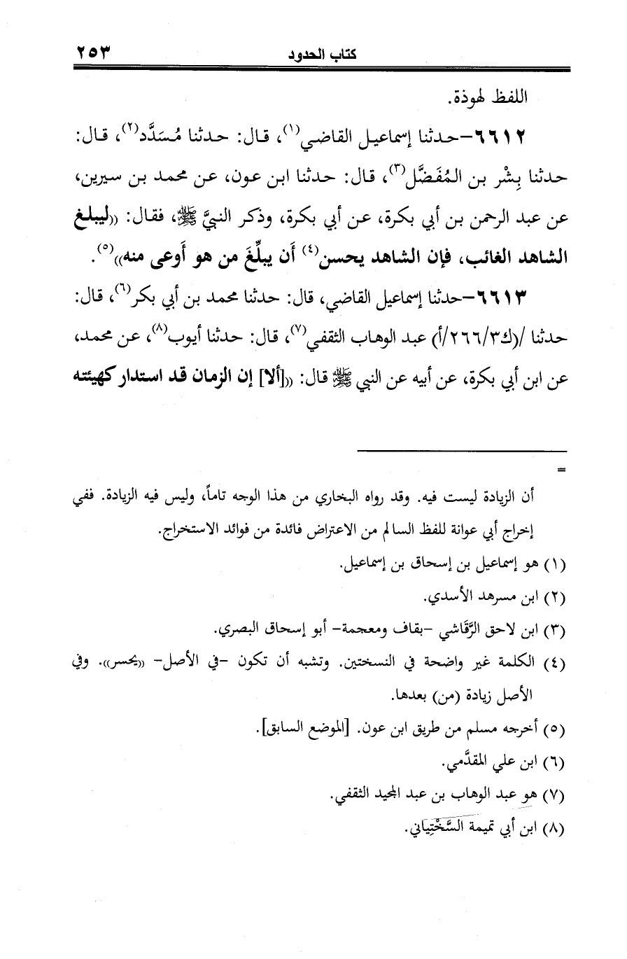 6613 - حدثنا إسماعيل القاضي، قال: حدثنا محمد بن أبي بكر (¬1)، قال: حدثنا عبد الوهاب الثقفي (¬2)، قال: حدثنا أيوب (¬3)، عن محمد، عن ابن أبي بكرة، عن أبيه عن النبي -صلى الله عليه وسلم- قال: " [ألا] إن الزمان قد استدار كهيئته