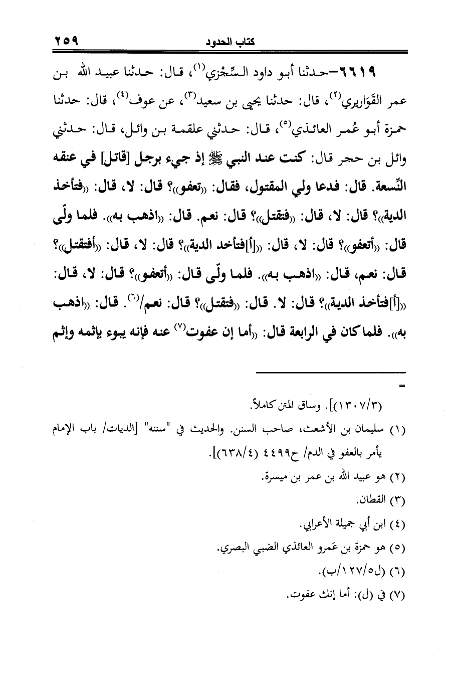 6619 - حدثنا أَبو داود السِّجْزي (¬1)، قال: حدثنا عبيد الله بن عمر القَوَاريري (¬2)، قال: حدثنا يحيى بن سعيد (¬3)، عن عوف (¬4)، قال: حدثنا حمزة أَبو عُمر العائذي (¬5)، قال: حدثني علقمة بن وائل، قال: حدثني وائل بن حجر قال: كنت عند النبي -صلى الله عليه وسلم- إذ جيء برجل [قاتل] في عنقه النِّسعة. قال: فدعا ولي المقتول، فقال: "تعفو"؟ قال: لا، قال: "فتأخذ الدية"؟ قال: لا، قال: "فتقتل"؟ قال: نعم. قال: "اذهب به". فلما ولّى قال: "أتعفو"؟ قال: لا، قال: " [أ] فتأخد الدية"؟ قال: لا، قال: "أفتقتل"؟ قال: نعم، قال: "اذهب به". فلما ولّى قال: "أتعفو"؟ قال: لا، قال: " [أ] فتأخذ الدية"؟ قال: لا. قال: "فتقتل"؟ قال: نعم / (¬6). قال: "اذهب به". فلما كان في الرابعة قال: "أما إن عفوت (¬7) عنه وإنه يبوء بإثمه وإثم