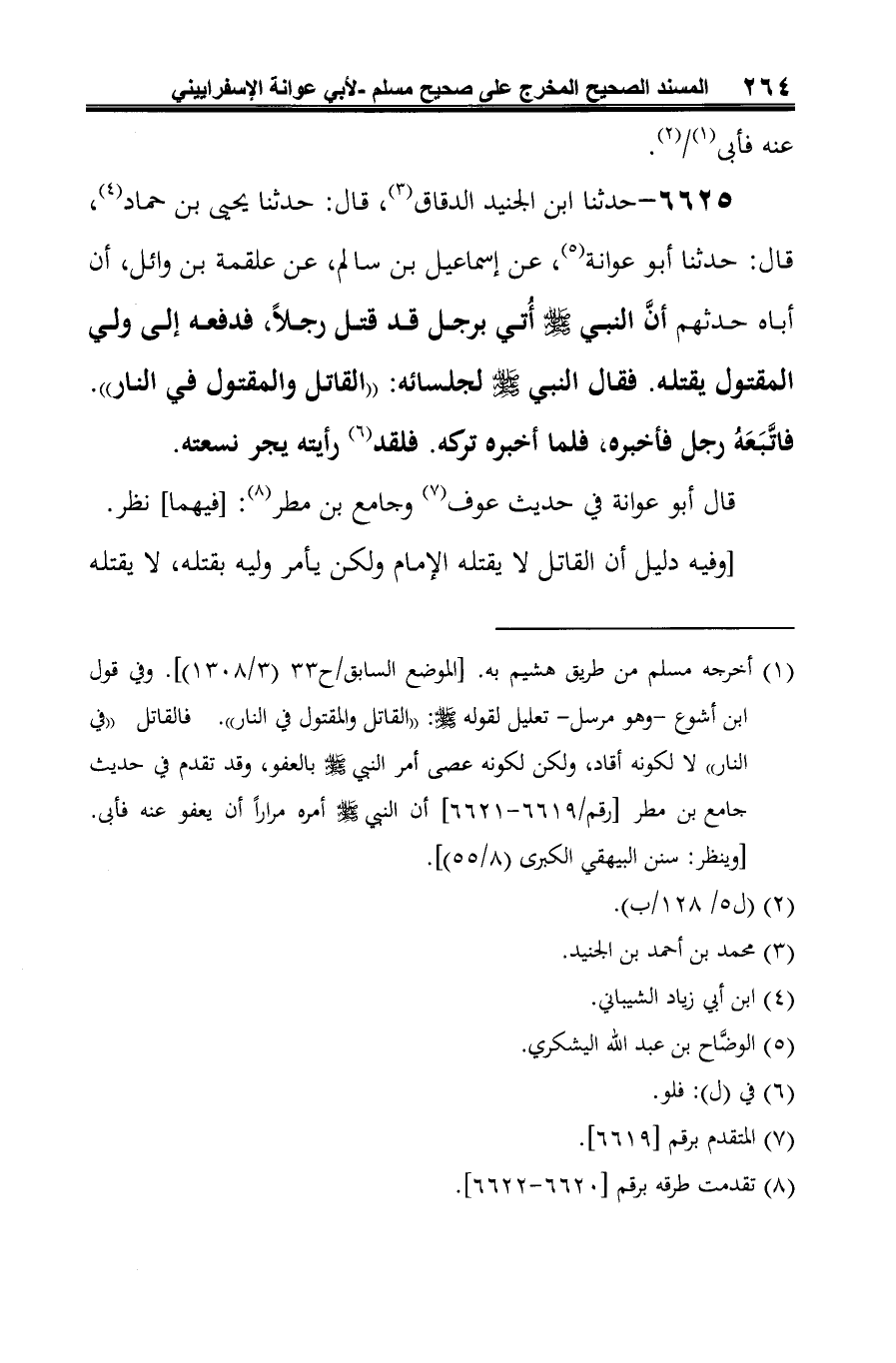 6625 - حدثنا ابن الجنيد الدقاق (¬1)، قال: حدثنا يحيى بن حماد (¬2)، قال: حدثنا أَبو عوانة (¬3)، عن إسماعيل بن سالم، عن علقمة بن وائل، أن أباه حدثهم أنَّ النبي -صلى الله عليه وسلم- أُتي برجل قد قتل رجلًا، فدفعه إلى ولي المقتول يقتله. فقال النبي -صلى الله عليه وسلم- لجلسائه: "القاتل والمقتول في النار".