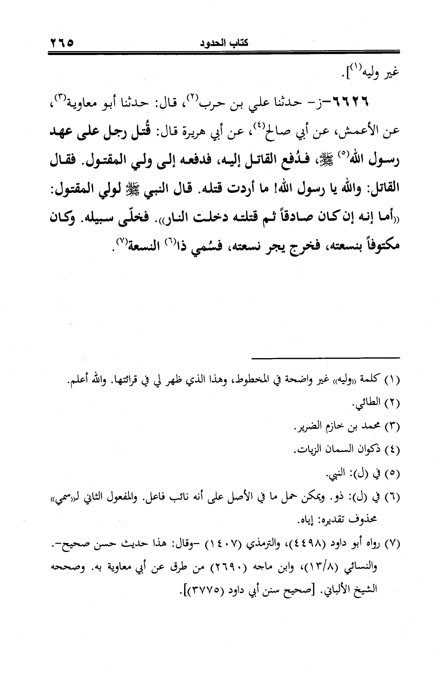 6626 - ز- حدثنا علي بن حرب (¬1)، قال: حدثنا أَبو معاوية (¬2)، عن الأعمش، عن أبي صالح (¬3)، عن أبي هريرة قال: قُتل رجل على عهد رسول الله (¬4) -صلى الله عليه وسلم-، فدُفع القاتل إليه، فدفعه إلى ولي المقتول. فقال القاتل: والله يا رسول الله! ما أردت قتله. قال النبي -صلى الله عليه وسلم- لولي المقتول: "أما إنه إن كان صادقًا ثم قتلته دخلت النار". فخلّى سبيله. وكان مكتوفًا بنسعته، فخرج يجر نسعته، فسُمي ذا (¬5) النسعة (¬6).