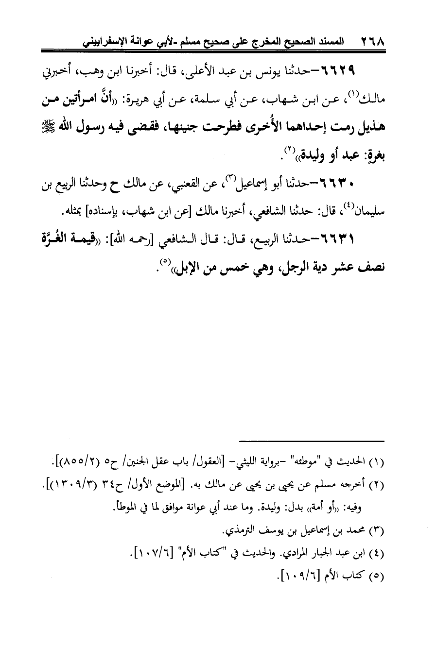 6631 - حدثنا الربيع، قال: قال الشافي [رحمه الله]: "قيمة الغُرَّة نصف عشر دية الرجل، وهي خمس من الإبل" (¬1).