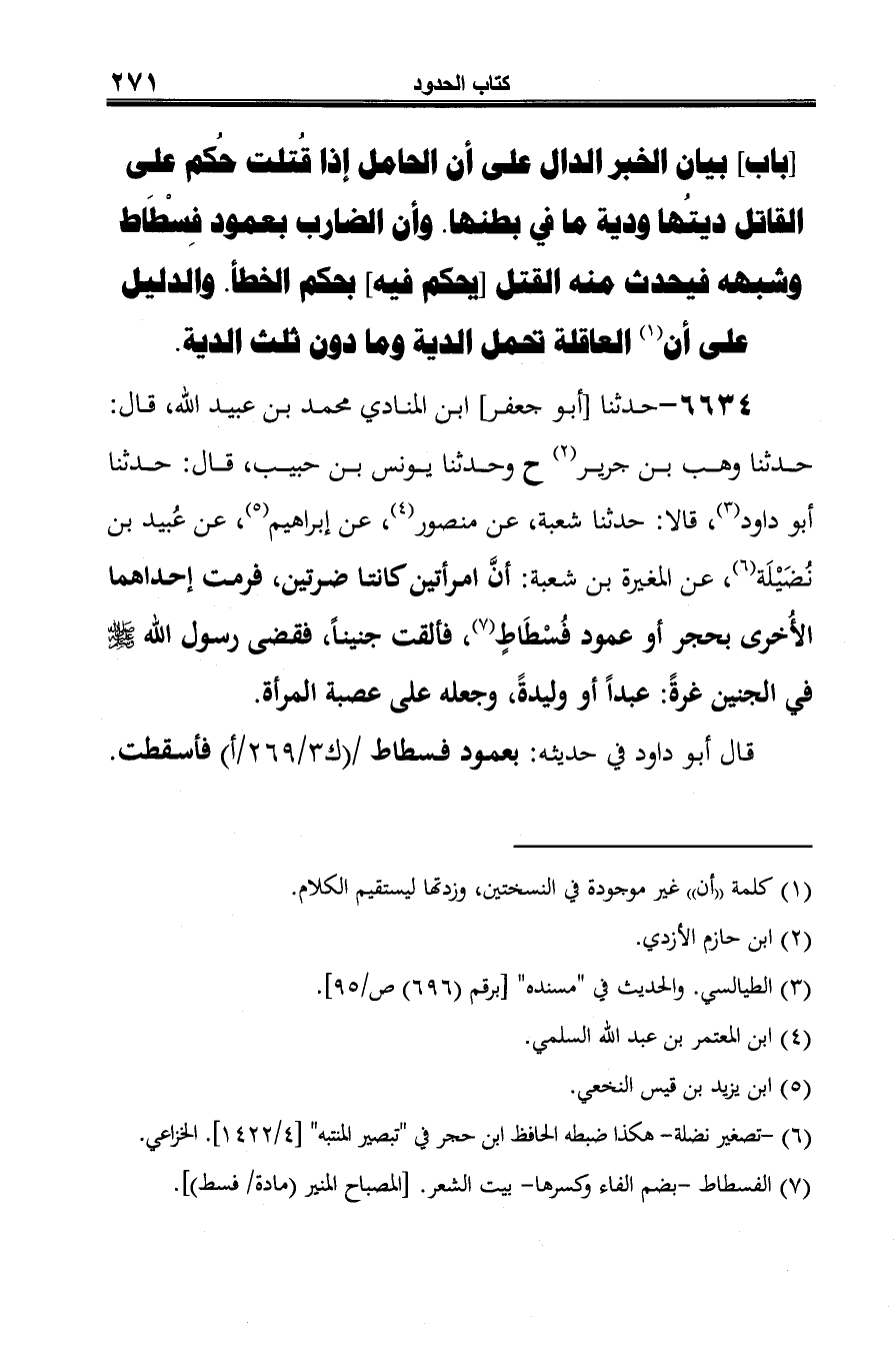 6634 - حدثنا [أبو جعفر] ابن المنادي محمد بن عبيد الله، قال: حدثنا وهب بن جرير (¬1) ح وحدثنا يونس بن حبيب، قال: حدثنا أَبو داود (¬2)، قالا: حدثنا شعبة، عن منصور (¬3)، عن إبراهيم (¬4)، عن عُبيد بن نُضَيْلَة (¬5)، عن المغيرة بن شعبة: أنَّ امرأتين كانتا ضرتين، فرمت إحداهما الأُخرى بحجر أو عمود فُسْطَاطٍ (¬6)، فالقت جنينًا، فقضى رسول الله -صلى الله عليه وسلم- في الجنين غرةً: عبدًا أو وليدةً، وجعله على عصبة المرأة.