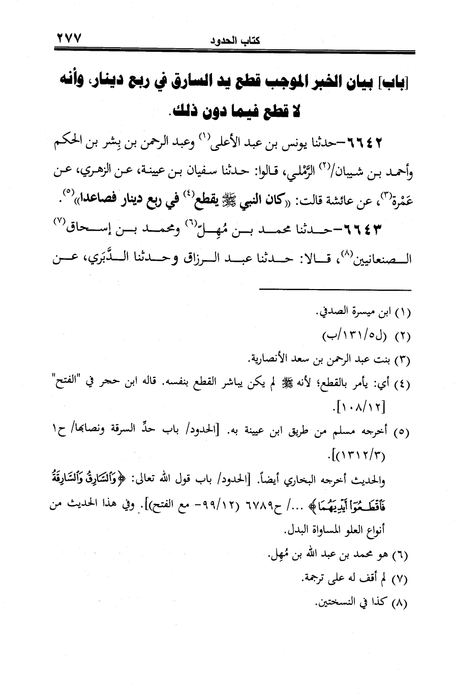 6642 - حدثنا يونس بن عبد الأعلى (¬1) وعبد الرحمن بن بِشر بن الحكم وأحمد بن شيبان / (¬2) الرَّمْلي، قالوا: حدثنا سفيان بن عيينة، عن الزهري، عن عَمْرة (¬3)، عن عائشة قالت: "كان النبي -صلى الله عليه وسلم- يقطع (¬4) في رب دينار فصاعدا" (¬5).