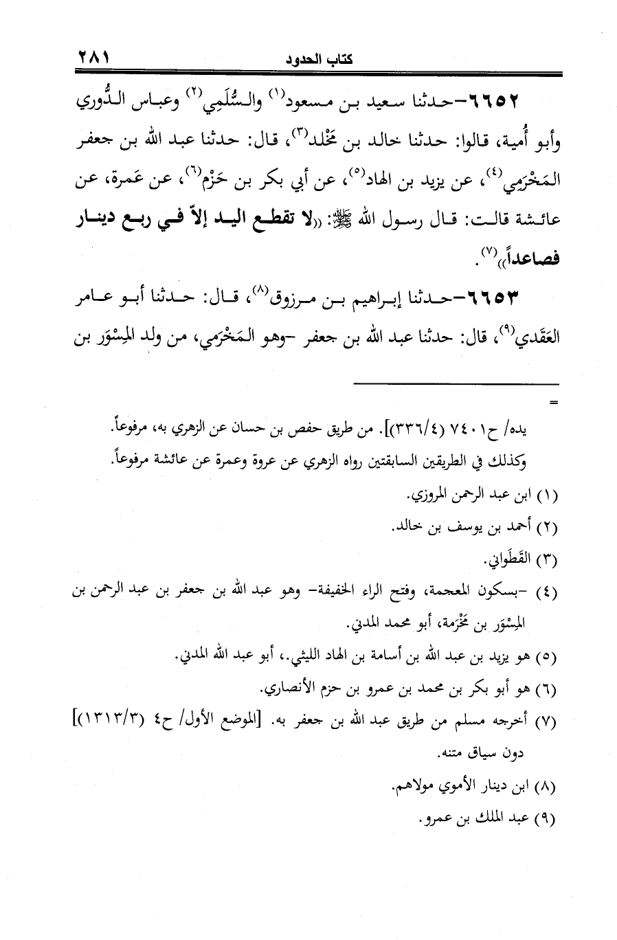 6652 - حدثنا سعيد بن مسعود (¬1) والسُّلَمِي (¬2) وعباس الدُّوري وأبو أُمية، قالوا: حدثنا خالد بن مَخْلد (¬3)، قال: حدثنا عبد الله بن جعفر المَخْرَمِي (¬4)، عن يزيد بن الهاد (¬5)، عن أبي بكر بن حَزْم (¬6)، عن عَمرة، عن عائشة قالت: قال رسول الله -صلى الله عليه وسلم-: "لا تقطع اليد إلّا في ربع دينار فصاعدًا" (¬7).