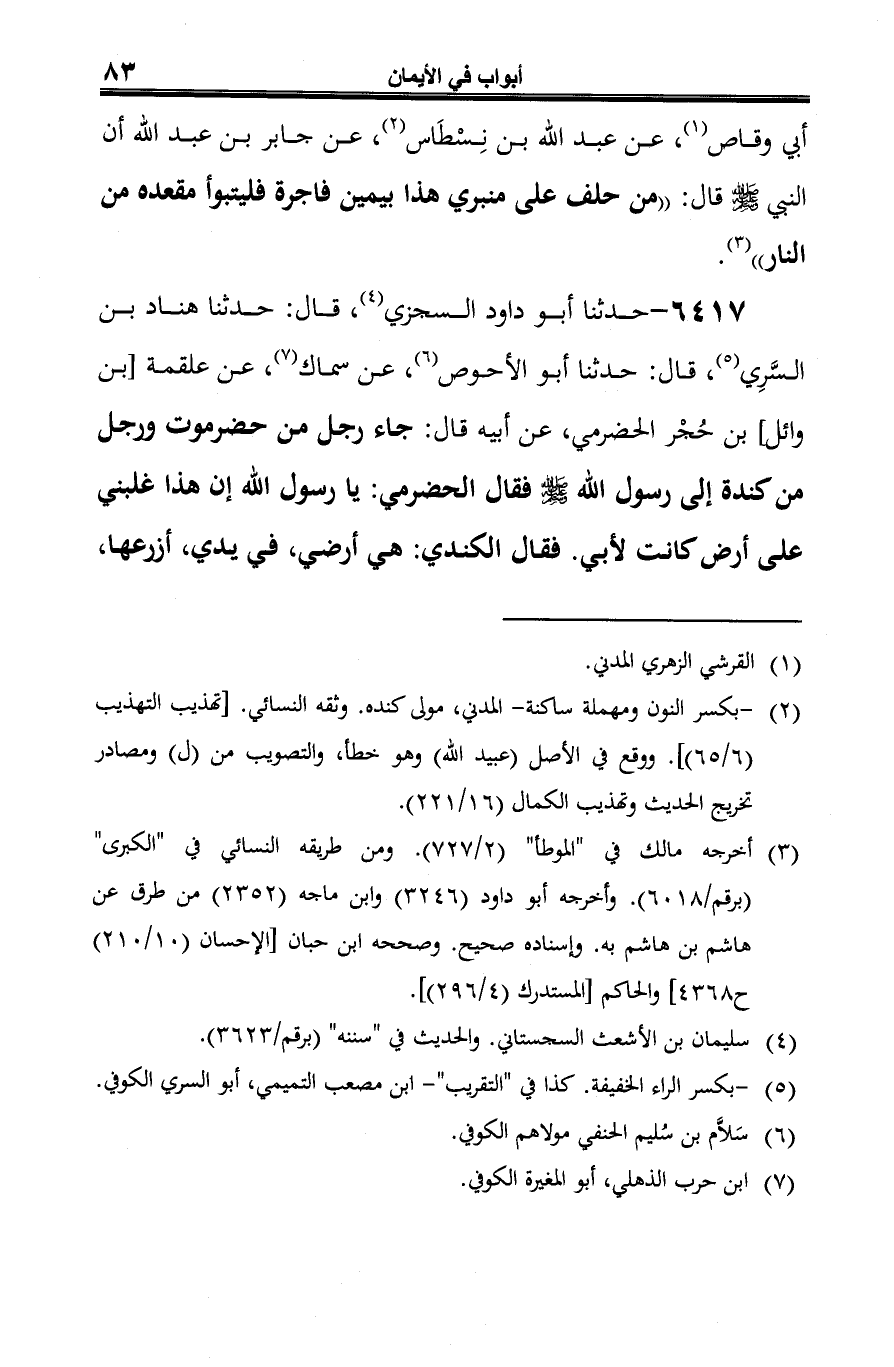 6417 - حدثنا أبو داود السجزي (¬1)، قال: حدثنا هناد بن السَّرِي (¬2)، قال: حدثنا أبو الأحوص (¬3)، عن سماك (¬4)، عن علقمة [بن وائل] بن حُجْر الحضرمي، عن أبيه قال: جيء رجل من حضرموت ورجل من كندة إلى رسول الله -صلى الله عليه وسلم- فقال الحضرمي: يا رسول الله إن هذا غلبني على أرض كانت لأبي. فقال الكندي: هي أرضي، في يدي، أزرعها،