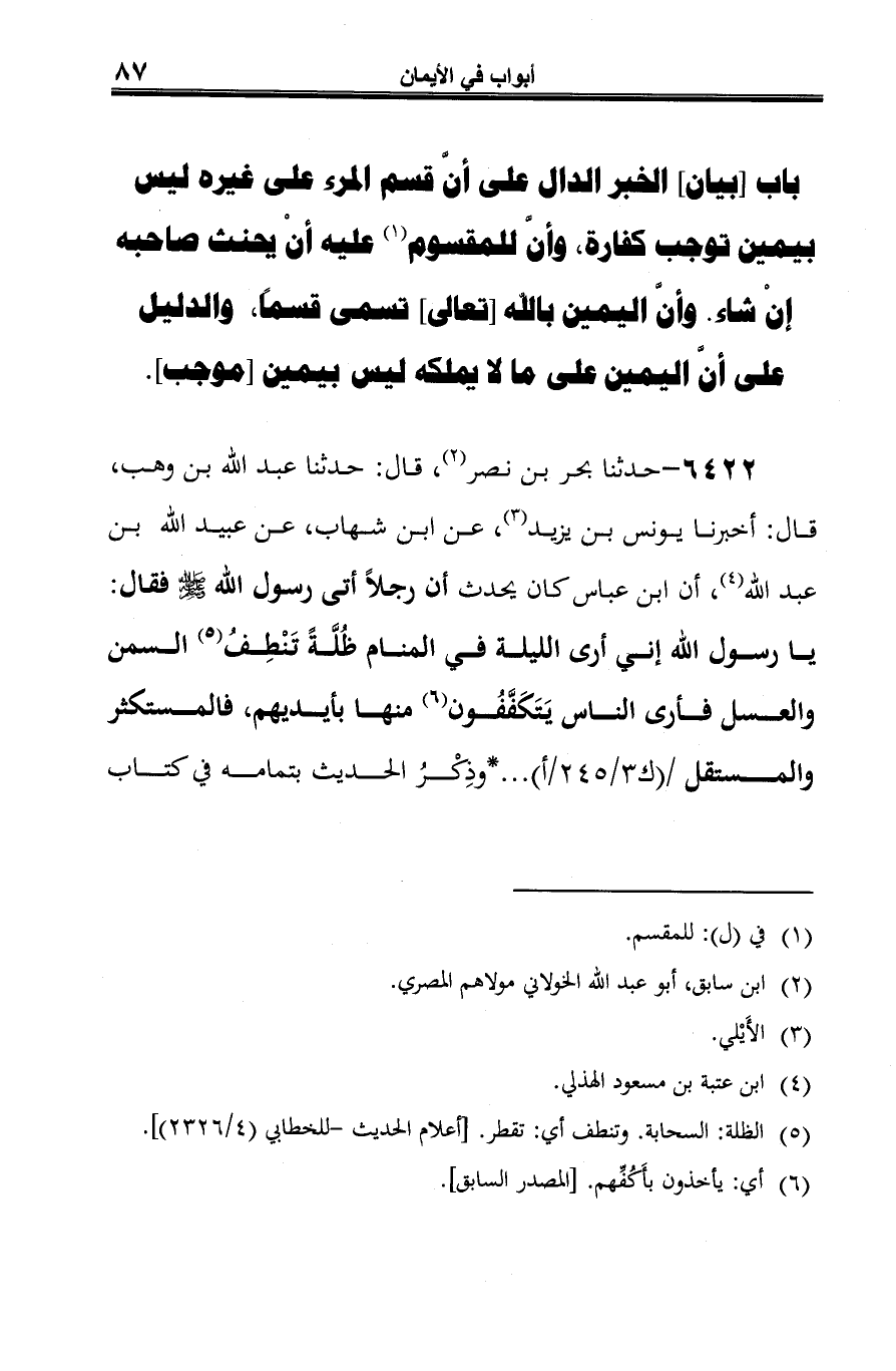 6422 - حدثنا بحر بن نصر (¬1)، قال: حدثنا عبد الله بن وهب، قال: أخبرنا يونس بن يزيد (¬2)، عن ابن شهاب، عن عبيد الله بن عبد الله (¬3)، أن ابن عباس كان يحدث أن رجلًا أتى رسول الله -صلى الله عليه وسلم- فقال: يا رسول الله إني أرى الليلة في المنام ظُلَّةً تَنْطِفُ (¬4) السمن والعسل فأرى الناس يَتَكَفَّفُون (¬5) منها بأيديهم، فالمستكثر والمستقل. . . *وذِكْرُ الحديث بتمامه في كتاب