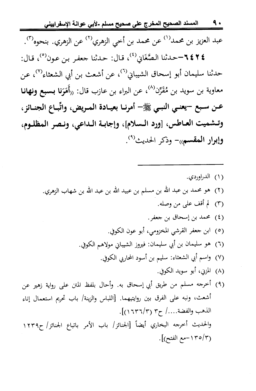 6424 - حدثنا الصَّغَاني (¬1)، قال: حدثنا جعفر بن عون (¬2)، قال: حدثنا سليمان أبو إسحاق الشيباني (¬3)، عن أشعث بن أبي الشعثاء (¬4)، عن معاوية بن سويد بن مُقَرِّن (¬5)، عن البراء بن عازب قال: "أَمَرَنا بسبع ونهانا عن سبع -يعني النبي -صلى الله عليه وسلم- أمرنا بعيادة المريض، واتّباع الجنائز، وتشميت العاطس، [ورد السلام]، وإجابة الداعي، ونصر المظلوم، وإبرار المقسم"- وذكر الحديث (¬6).