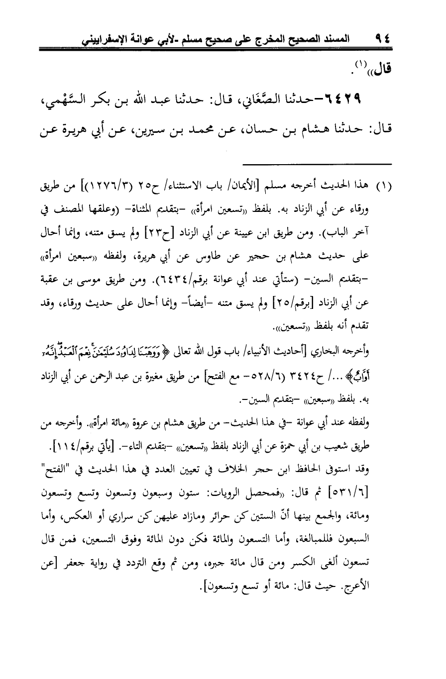 (¬3) أخرجه مسلم [الأيمان / باب الإستثناء/ ح 22 (3/ 1275)]. من طريق حماد بن زيد عن أيوب السختياني عن ابن سيرين بلفظ "ستون امرأة". وهي الطريق التالية عند المصنف.