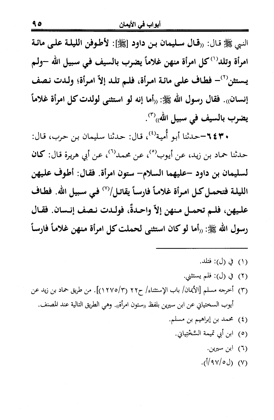 6430 - حدثنا أبو أُمية (¬1)، قال: حدثنا سليمان بن حرب، قال: حدثنا حماد بن زيد، عن أيوب (¬2)، عن محمَّد (¬3)، عن أبي هريرة قال: كان لسليمان بن داود -عليهما السلام- ستون امرأة. فقال: أطوف عليهن الليلة فتحمل كل امرأة غلامًا فارسًا يقاتل / (¬4) في سبيل الله. فطاف عليهن، فلم تحمل منهن إلَّا واحدةٌ، فولدت نصف إنسان. فقال رسول الله -صلى الله عليه وسلم-: "أما لو كان استثنى لحملت كل امرأة منهن غلامًا فارسًا