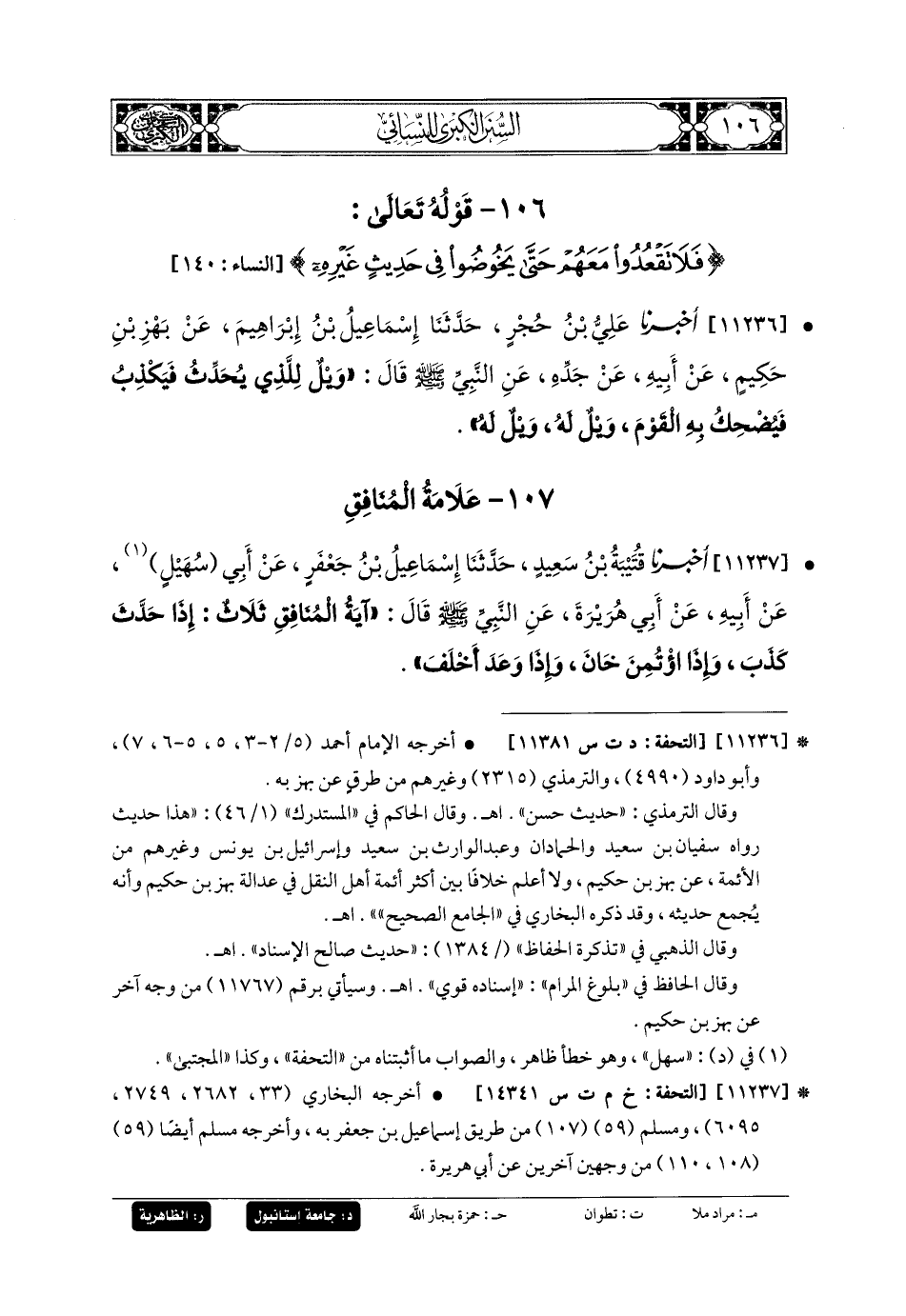 11237- أَخبَرنا قُتَيبَةُ بنُ سَعِيدٍ، حَدثنا إِسمَاعِيلُ بنُ جَعفَرٍ، عَن أَبي سُهَيلٍ، عَن أَبيهِ، عَن أَبي هُرَيرَةَ، عَنِ النَّبيِّ صَلى الله عَليه وسَلم قَالَ: آيَةُ المُنَافِقِ ثَلاثٌ: إِذَا حَدَّثَ كَذَبَ، وَإِذَا اؤْتُمِنَ خَانَ، وَإِذَا وَعَدَ أَخْلَفَ.