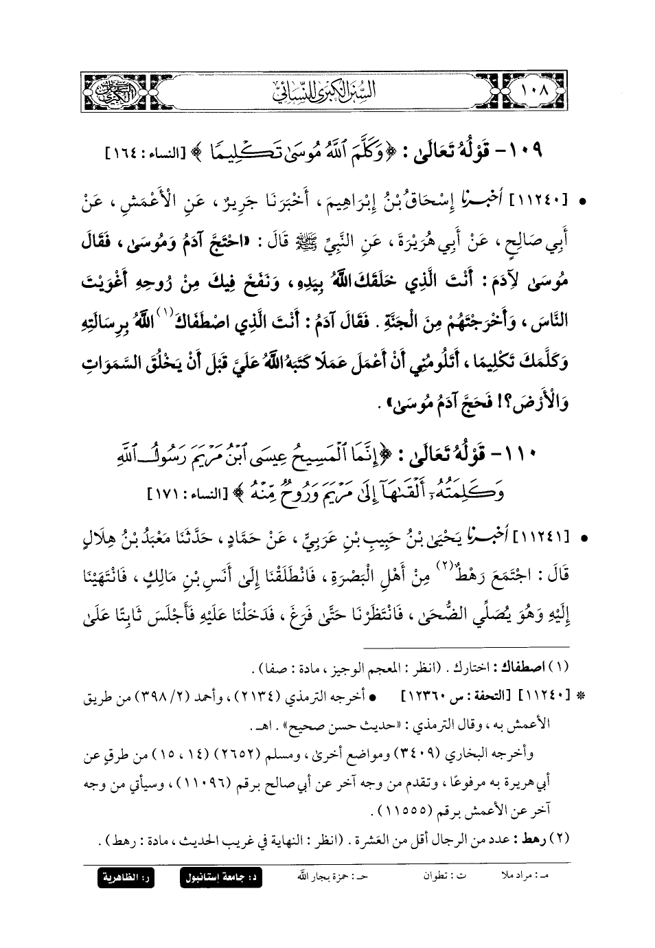 11240- أَخبَرنا إِسحَاقُ بنُ إِبرَاهِيمَ، أَخبَرنا جَرِيرٌ، عَنِ الأَعْمَشِ، عَن أَبي صَالِحٍ، عَن أَبي هُرَيرَةَ، عَنِ النَّبيِّ صَلى الله عَليه وسَلم قَالَ: احْتَجَّ آدَمُ وَمُوسَى، فَقَالَ مُوسَى لآدَمَ: أَنْتَ الَّذِي خَلَقَكَ اللهُ بِيَدِهِ، وَنَفَخَ فِيكَ مِنْ رُوحِهِ، أَغْوَيْتَ النَّاسَ، وَأَخْرَجْتَهُمْ مِنَ الجَنَّةِ، فَقَالَ آدَمُ: أَنْتَ الَّذِي اصْطَفَاكَ اللهُ بِرِسَالَتِهِ، وَكَلَّمَكَ تَكْلِيمًا، أَتَلُومُنِي أَنْ أَعْمَلَ عَمَلاً كَتَبَهُ اللهُ عَلَيَّ قَبْلَ أَنْ يَخْلُقَ السَّمَاوَاتِ وَالأَرْضِ؟ فَحَجَّ آدَمُ مُوسَى.