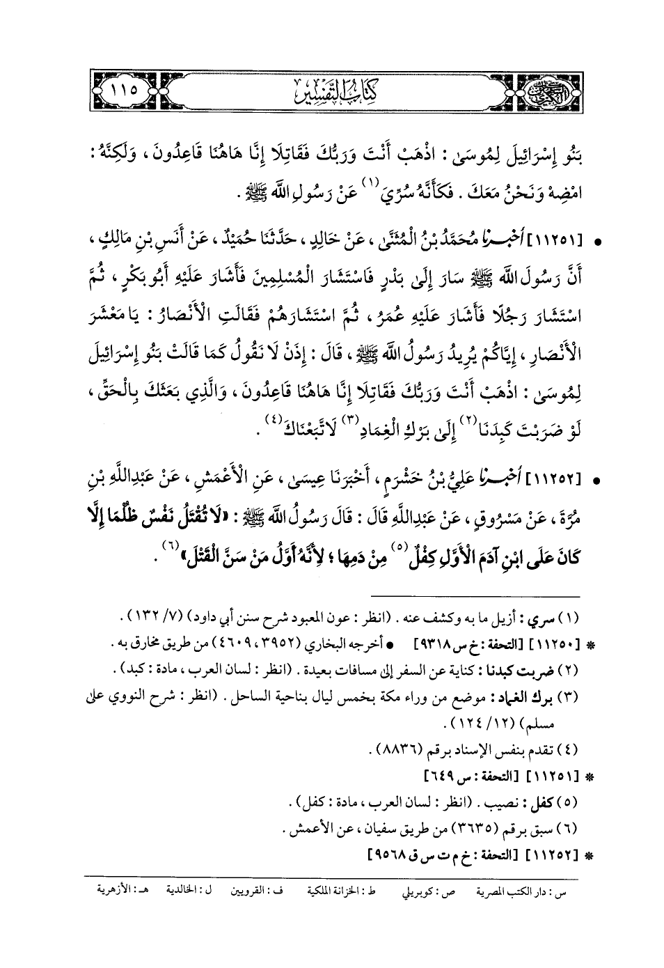 11251- أَخبَرنا مُحَمدُ بنُ المُثَنَّى، عَن خَالِدٍ، حَدثنا حُمَيْدٌ، عَن أَنَسِ بنِ مَالِكٍ، أَنَّ رَسُولَ اللهِ صَلى الله عَليه وسَلم سَارَ إِلَى بَدْرٍ فَاسْتَشَارَ المُسْلِمِينَ، فَأَشَارَ عَلَيْهِ أَبو بَكْرٍ، ثُمَّ اسْتَشَارَ رَجُلاً، فَأَشَارَ عَلَيْهِ عُمَرُ، ثُمَّ اسْتَشَارَهُمْ، فَقَالَتِ الأَنْصَارُ: يَا مَعْشَرَ الأَنْصَارِ، إِيَّاكُمْ يُرِيدُ رَسُولَ اللهِ صَلى الله عَليه وسَلم، قَالَ: إِذًا لا نَقُولُ كَمَا قَالَتْ بَنُو إِسرَائِيلَ لِمُوسَى: {اذْهَبْ أَنْتَ وَرَبُّكَ فَقَاتِلا إِنَّا هَاهُنَا قَاعِدُونَ} وَالَّذِي (1) بَعَثَكَ بِالحَقِّ، لَوْ ضَرَبْتَ كَبِدَنَا إِلَى بِرْكِ الغِمَادِ لاتَّبَعْنَاكَ.