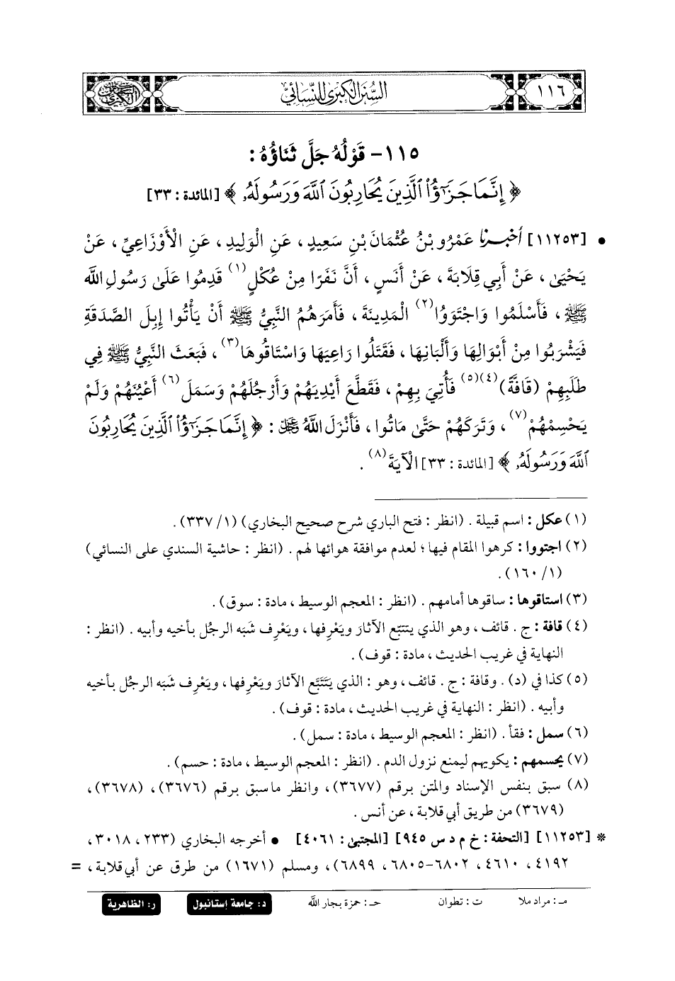 11253- أَخبَرنا عَمرُو بنُ عُثْمَانَ بنِ سَعِيدٍ، عَنِ الوَلِيدِ، عَنِ الأَوْزَاعِيِّ، عَن يَحيَى، عَن أَبي قِلابَةَ، عَن أَنَسٍ، أَنَّ نَفَرًا مِنْ عُكْلٍ قَدِمُوا عَلَى رَسُولِ اللهِ صَلى الله عَليه وسَلم فَأَسْلَمُوا وَاجْتَوَوَا المَدِينَةَ، فَأَمَرَهُمُ النَّبيُّ صَلى الله عَليه وسَلم أَنْ يَأْتُوا إِبِلَ الصَّدَقَةِ، فَيَشْرَبُوا مِنْ أَبْوَالِهَا وَأَلْبَانِهَا، فَقَتَلُوا رَاعِيَهَا وَاسْتَاقُوهَا، فَبَعَثَ النَّبيُّ صَلى الله عَليه وسَلم فِي طَلَبِهِمْ قَافةً، فَأُتِيَ بِهِمْ، فَقَطَعَ أَيْدِيَهُمْ وَأَرْجُلَهُمْ (1)، وَسَمَلَ أَعْيُنَهُمْ، وَلَمْ يَحْسِمْهُمْ، وَتَرَكَهُمْ حَتَّى مَاتُوا، فَأَنْزَلَ اللهُ عَزَّ وَجَلَّ: {إِنَّمَا جَزَاءُ الَّذِينَ يُحَارِبُونَ اللهَ وَرَسُولَهُ} الآيَةَ.