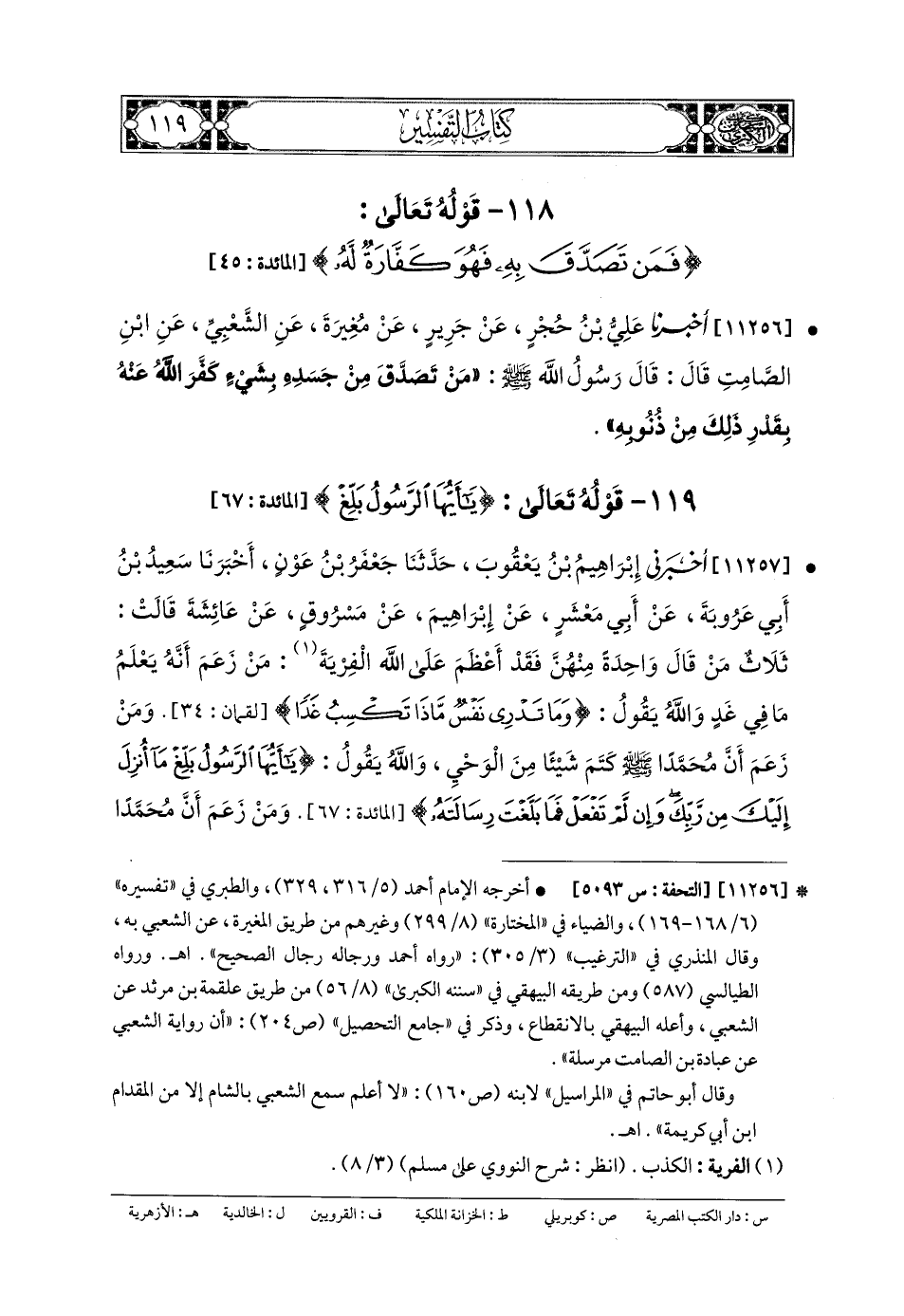118- قَوْلُهُ تَعَالَى: {فَمَنْ تَصَدَّقَ بِهِ فَهُوَ كَفَّارَةٌ لَهُ}.