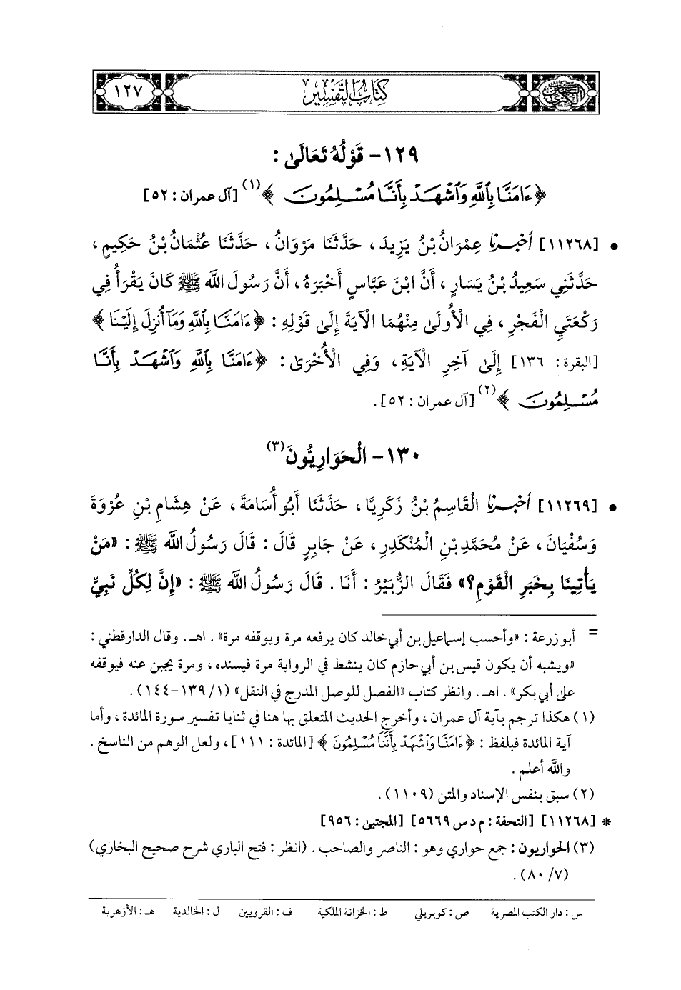 11269- أَخبَرنا القَاسِمُ بنُ زَكَرِيَّا، حَدثنا أَبو أُسَامَةَ، عَن هِشَامِ بنِ عُرْوَةَ، وَسُفيانَ، عَن مُحَمدِ بنِ المُنْكَدِرِ، عَن جَابِرٍ، قَالَ: قَالَ رَسُولُ اللهِ صَلى الله عَليه وسَلم: مَنْ يَأْتِينَا بِخَبَرِ القَوْمِ؟ فَقَالَ الزُّبَيْرُ: أَنَا، قَالَ رَسُولُ اللهِ صَلى الله عَليه وسَلم: إِنَّ لِكُلِّ نَبِيٍّ حَوَارِيًّا، وَحَوَارِيَّ الزُّبَيْرُ.