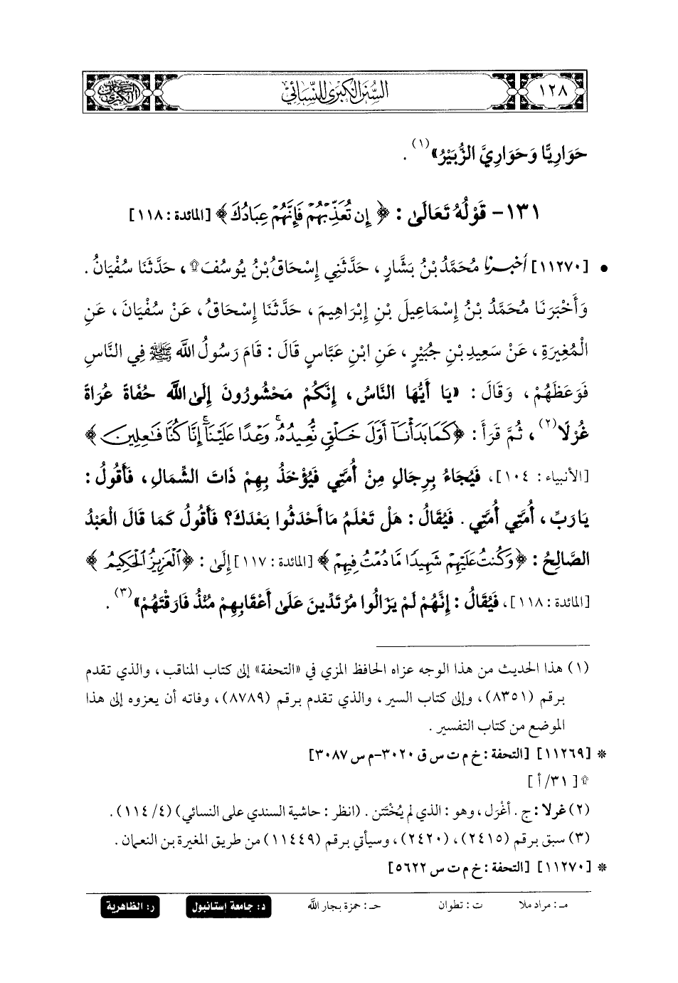 11270- أَخبَرنا مُحَمدُ بنُ بَشَّارٍ، حَدَّثني إِسحَاقُ بنُ يُوسُفَ، حَدثنا سُفيانُ (ح) وَأَخبَرنا مُحَمدُ بنُ إِسمَاعِيلَ بنِ إِبرَاهِيمَ، حَدثنا إِسحَاقُ، عَن سُفيانَ، عَنِ المُغِيرَةِ، عَن سَعِيدِ بنِ جُبَيرٍ، عَنِ ابنِ عَبَّاسٍ، قَالَ: قَامَ رَسُولُ اللهِ صَلى الله عَليه وسَلم فِي النَّاسِ، فَوَعَظَهُمْ، وَقَالَ: يَا أَيُّهَا النَّاسُ، إِنَّكُمْ مَحْشُورُونَ إِلَى اللهِ حُفَاةً عُرَاةً غُرْلاً، ثُمَّ قَرَأَ: {كَمَا بَدَأْنَا أَوَّلَ خَلْقٍ نُعِيدُهُ وَعْدًا عَلَيْنَا إِنَّا كُنَّا فَاعِلِينَ} فَيُجَاءُ بِرِجَالٍ مِنْ أُمَّتِي فَيُؤْخَذُ بِهِمْ ذَاتَ الشِّمَالِ، فَأَقُولُ: يَا رَبِّ أُمَّتِي أُمَّتِي، فَيُقَالُ: هَلْ تَعْلَمُ مَا أَحْدَثُوا بَعْدَكَ؟ فَأَقُولُ كَمَا قَالَ العَبدُ الصَّالِحُ: {وَكُنْتُ عَلَيْهِمْ شَهِيدًا مَا دُمْتَ فِيهِمْ} إِلَى: {العَزِيزُ الحَكِيمُ} فَيُقَالُ: إِنَّهُمْ لَمْ يَزَالُوا مُرْتَدِّينَ عَلَى أَعْقَابِهِمْ مُنْذُ فَارَقْتَهُمْ.